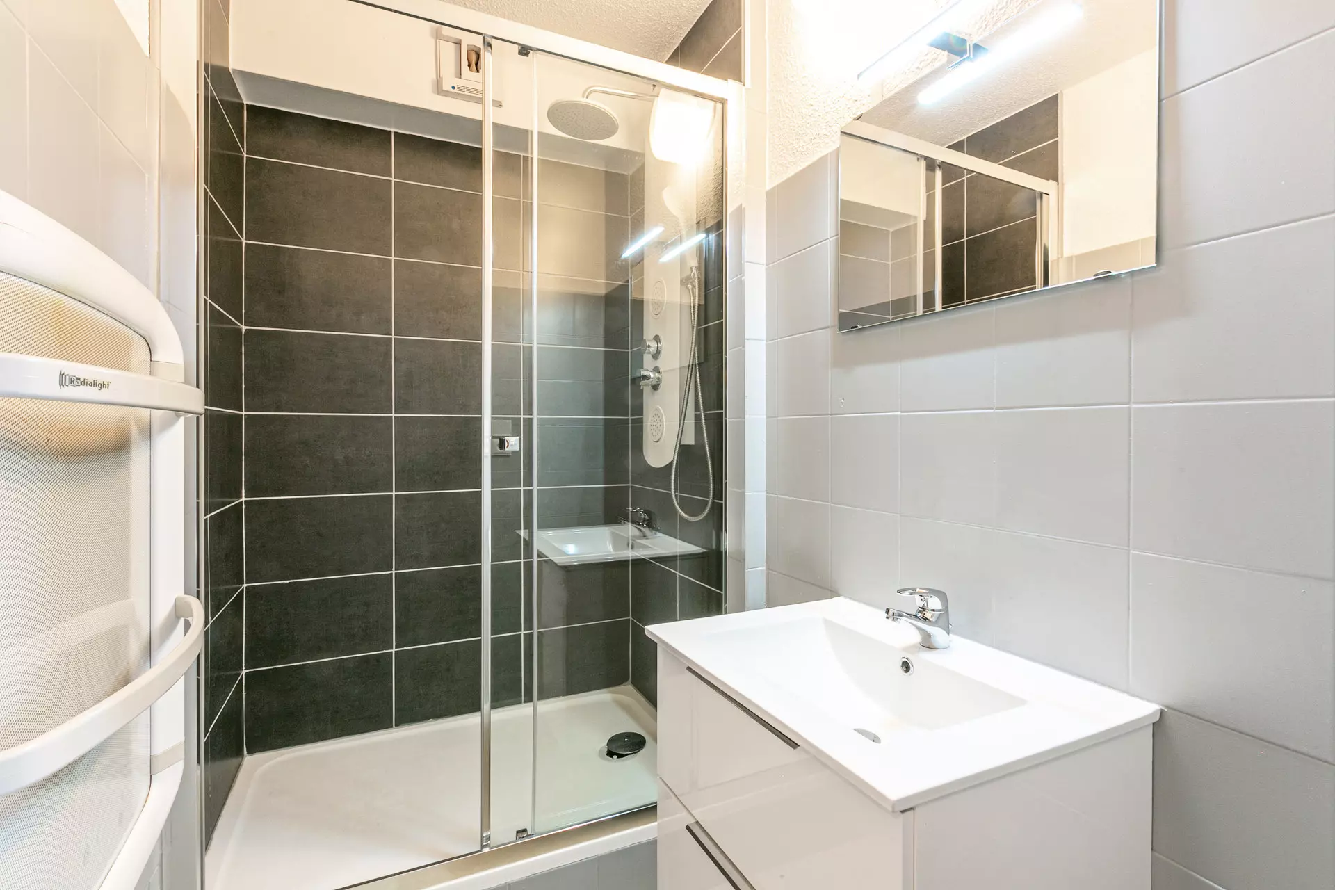 - Salle de bain : douche, vasque, sèche-serviettes, sèche cheveux