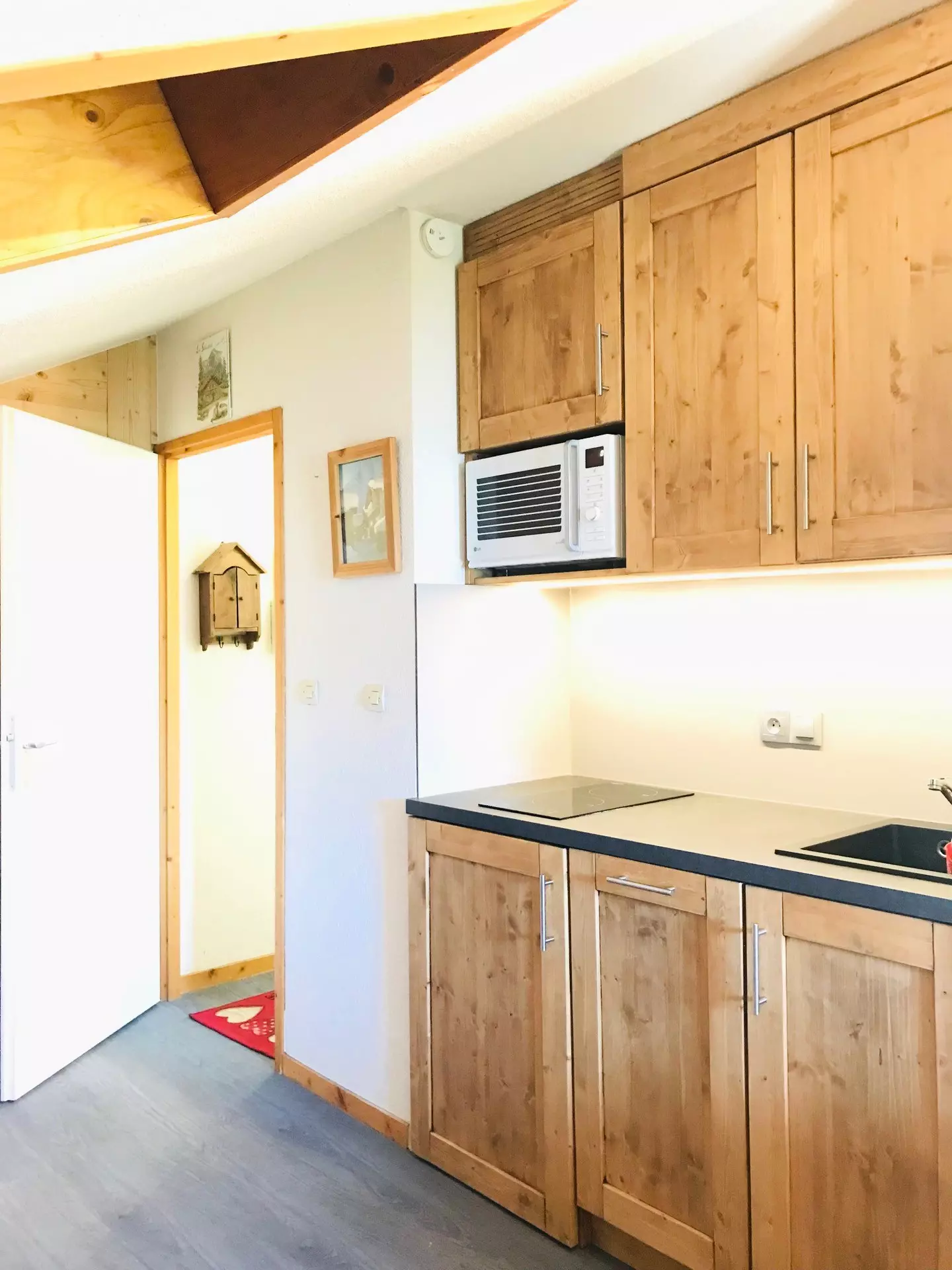 La cuisine,ouverte sur le séjour, est équipée de plaques électriques, d'un réfrigérateur, d'un micro-ondes, d'une cafetière, d'un lave vaisselle et d'un appareil à raclette.