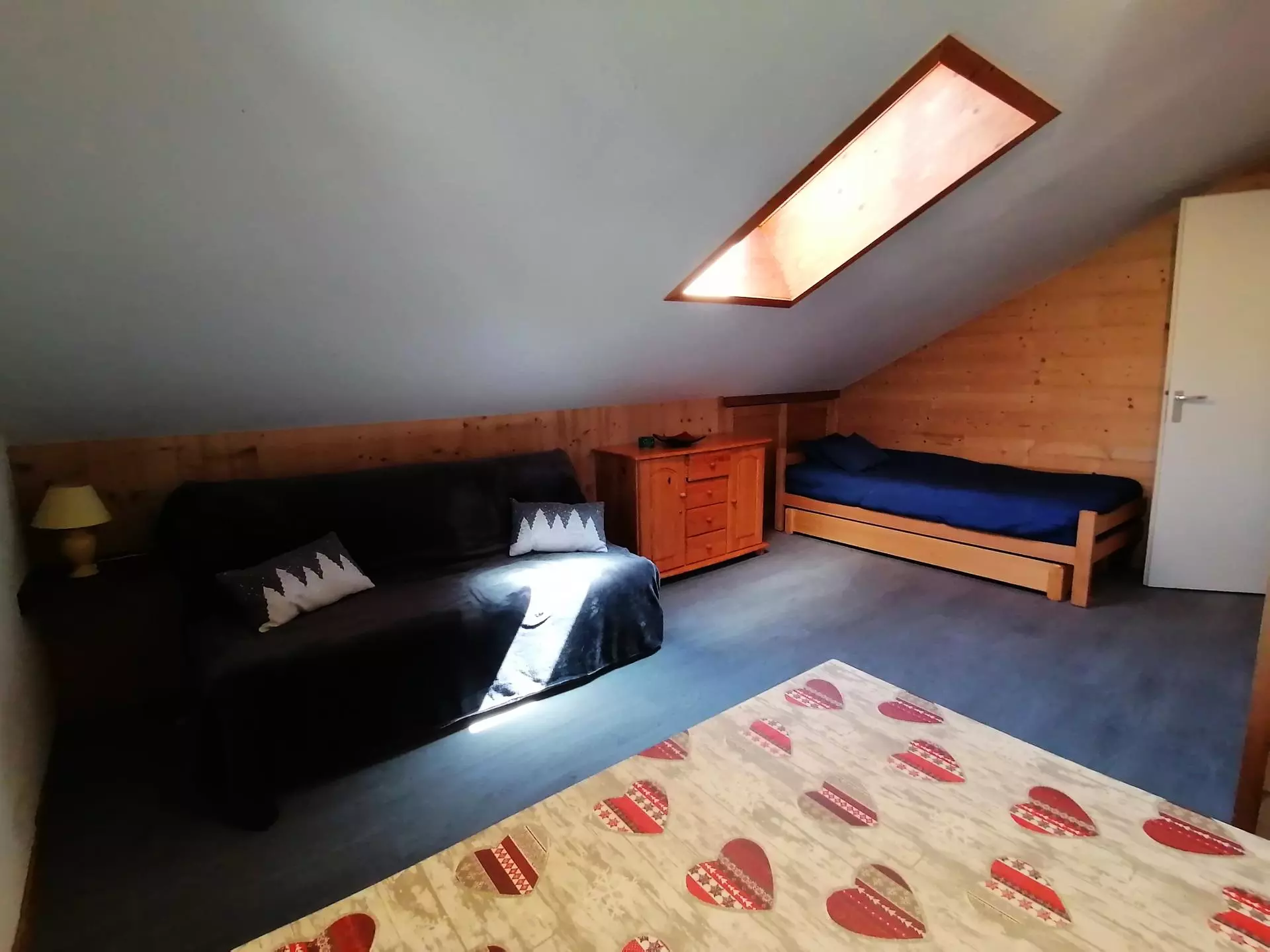 Un coin montagne accueille 2 lits superposés 90 (ne convient pas aux enfants de moins de 6 ans) et un placard de rangement. La chambre dispose d'un lit double 160 surélévé avec de nombreux rangements en dessous.
