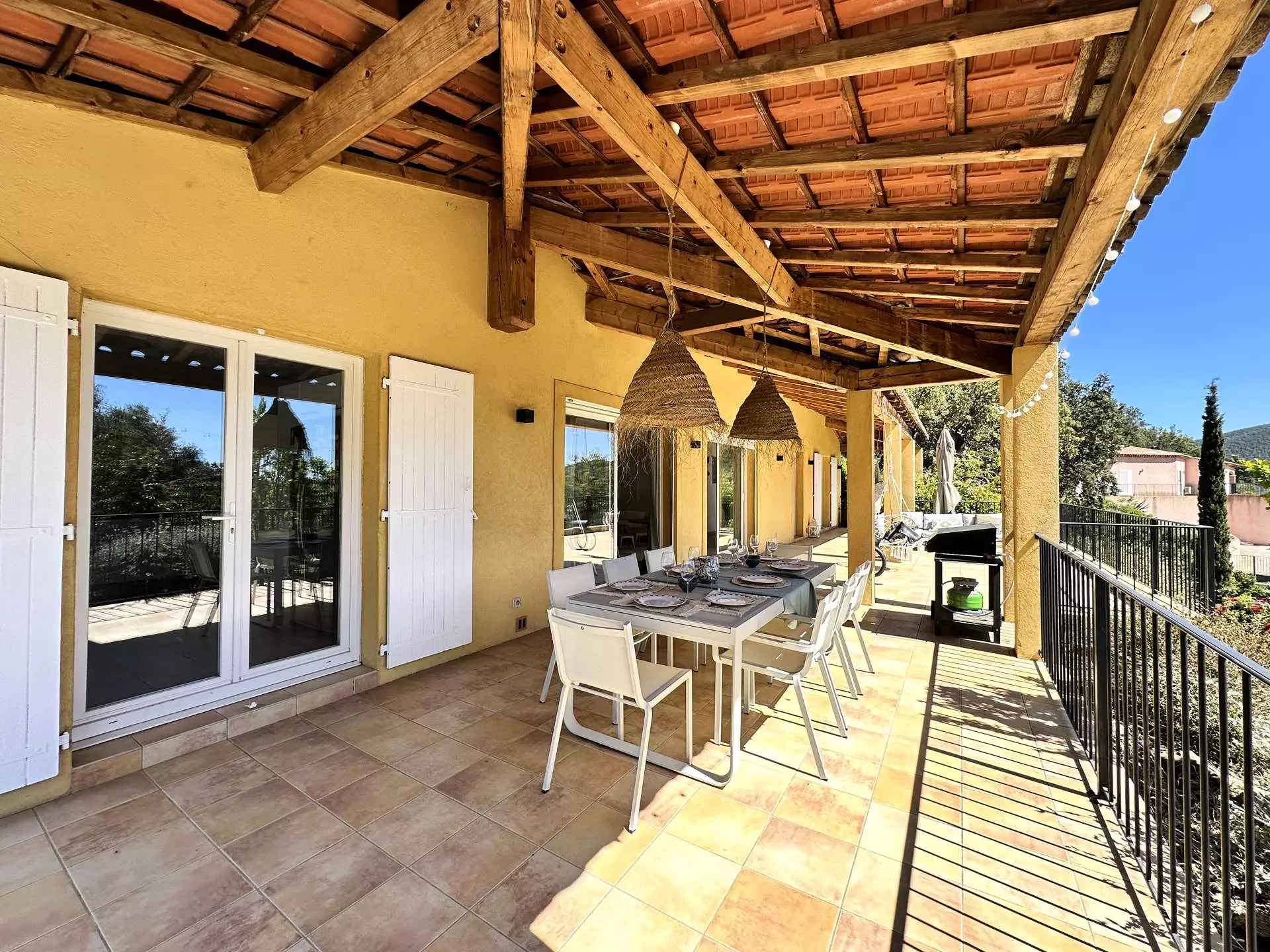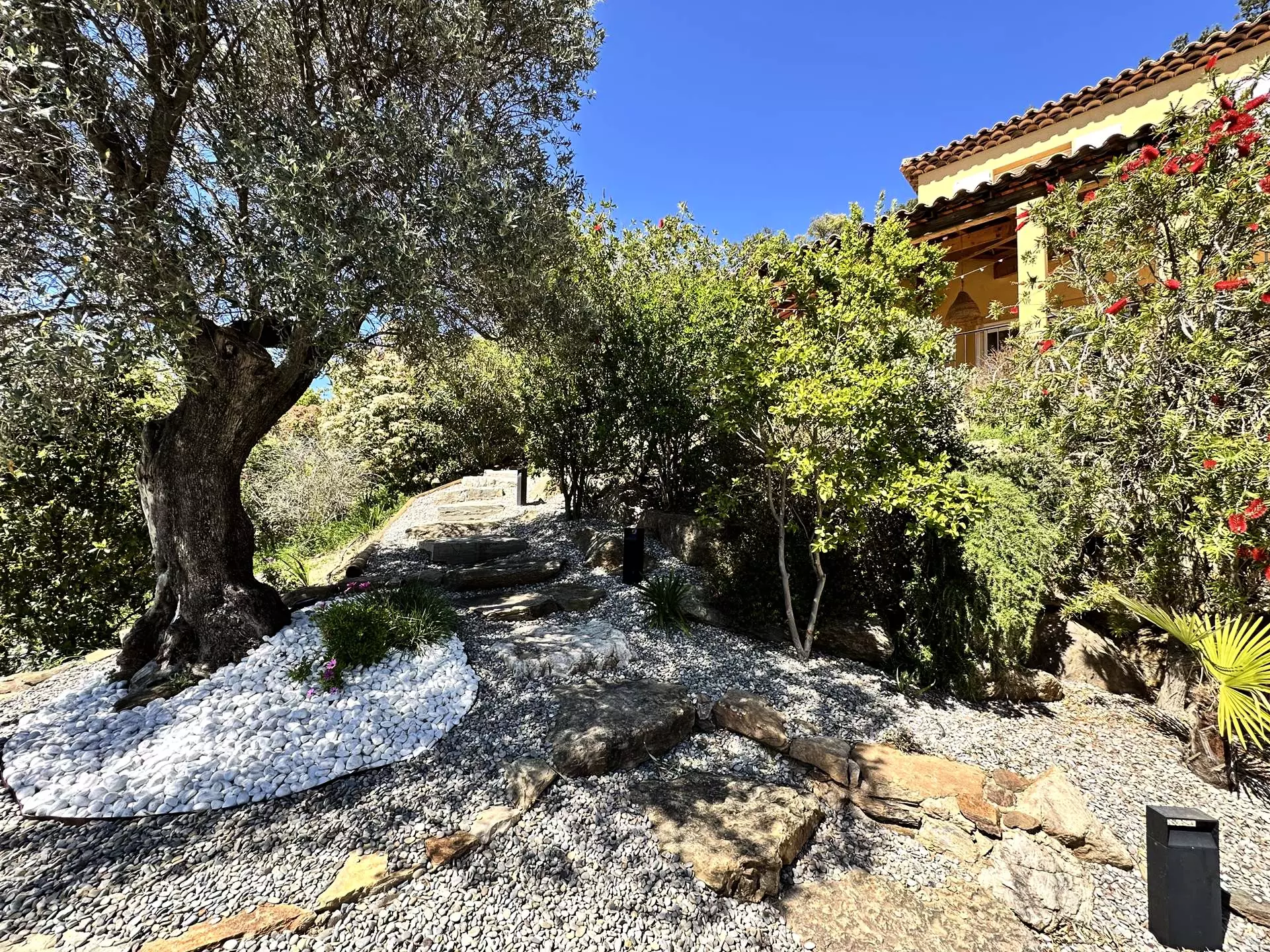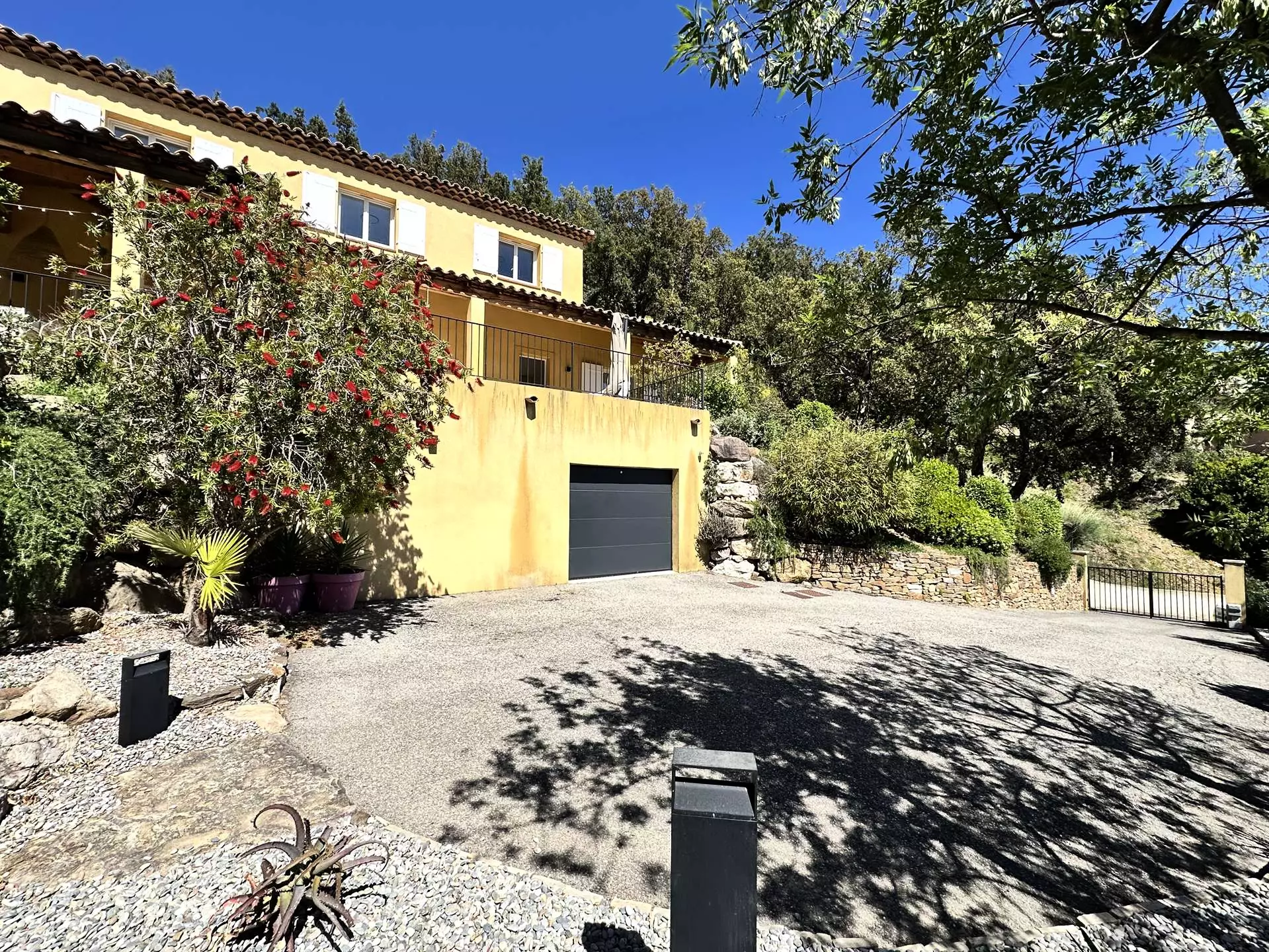 La maison est sur un terrain clos de 4000 m2, assurant une belle tranquillité. Les abords de la villa sont aménagés d'un jardin arboré méditerranéen (arrosage goutte à goutte automatique) qui se prolonge par une chênaie typique du massif des maures.