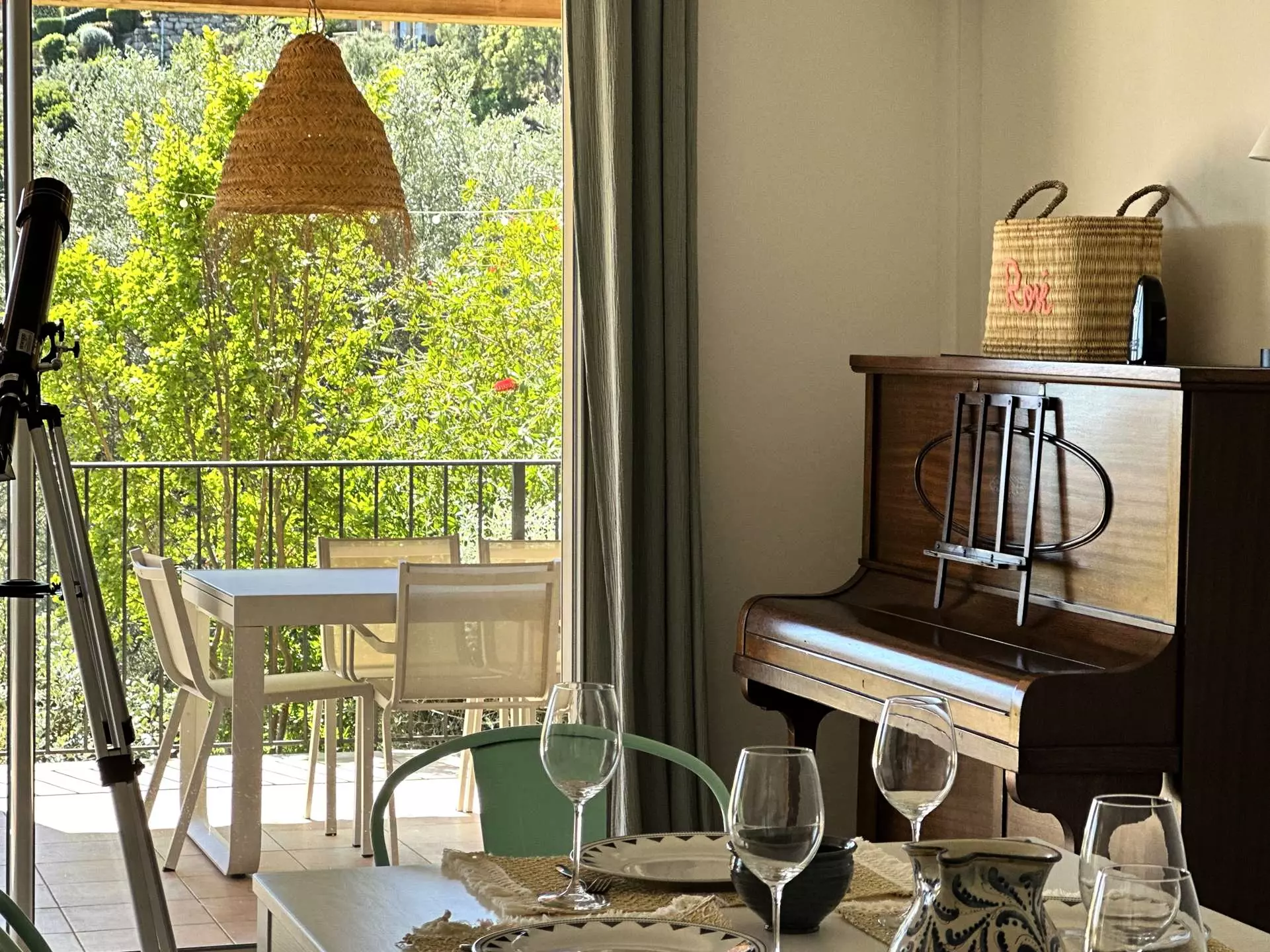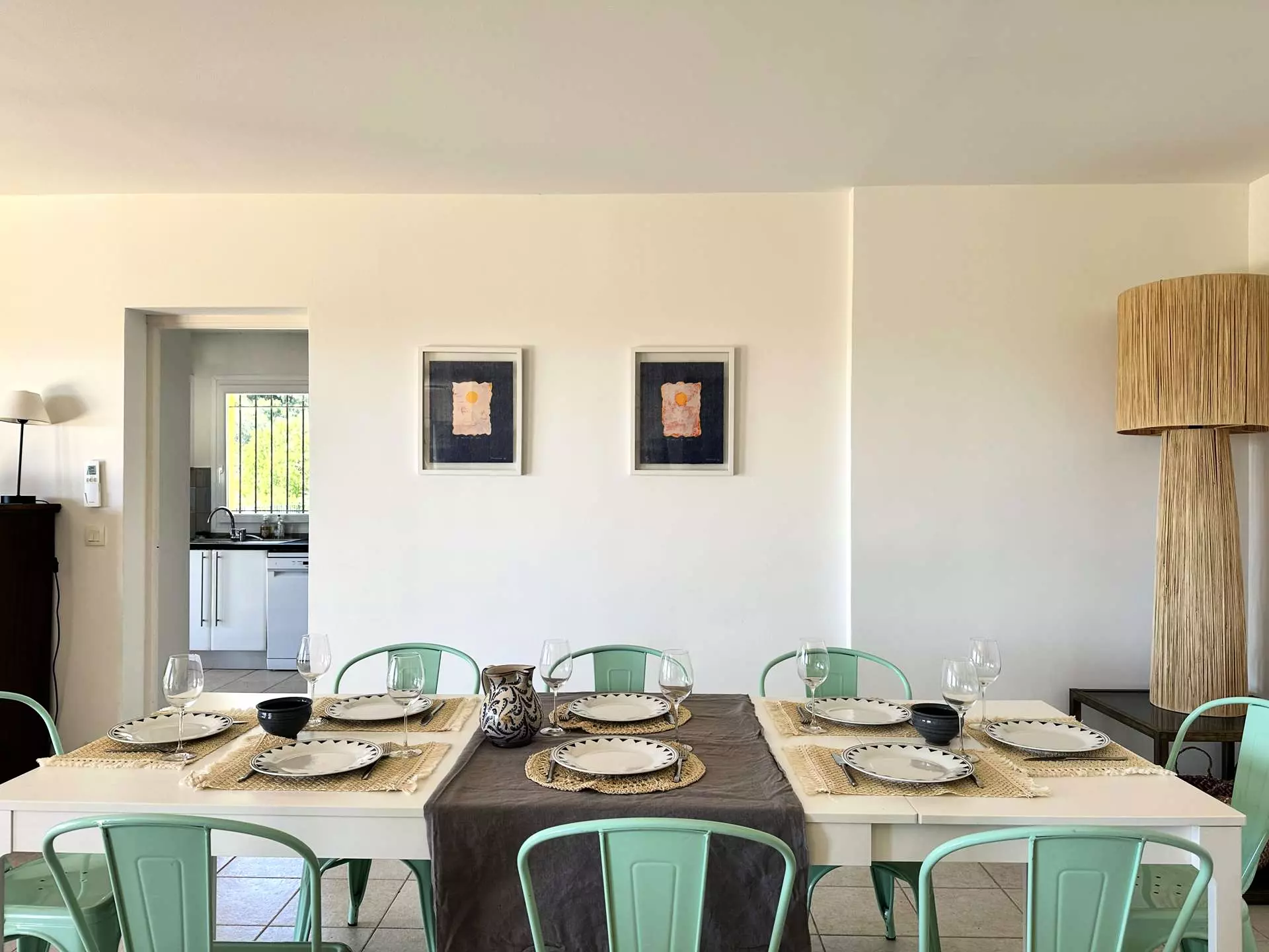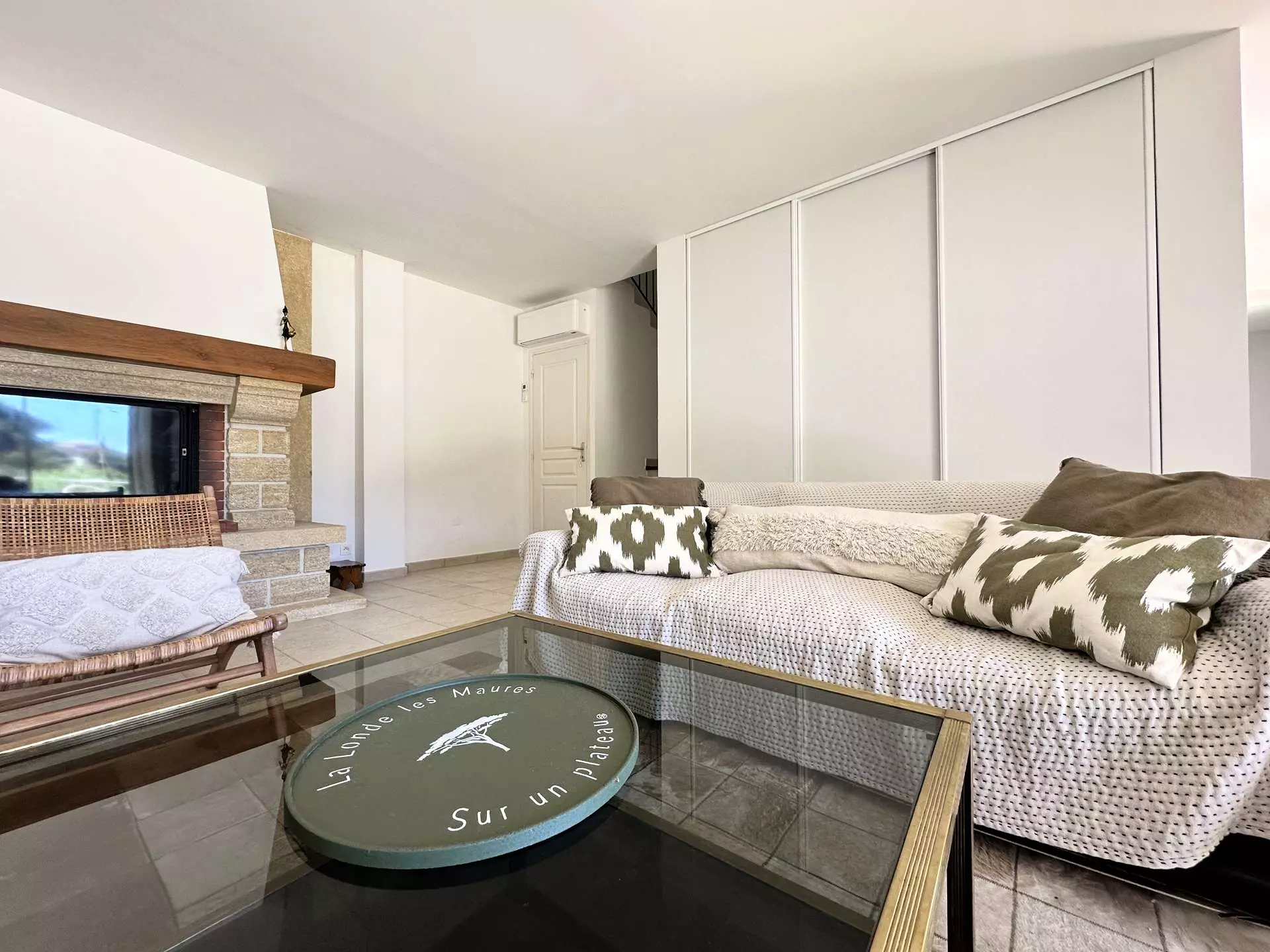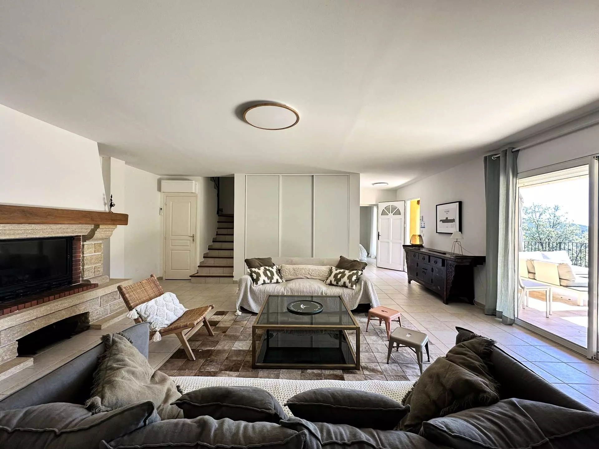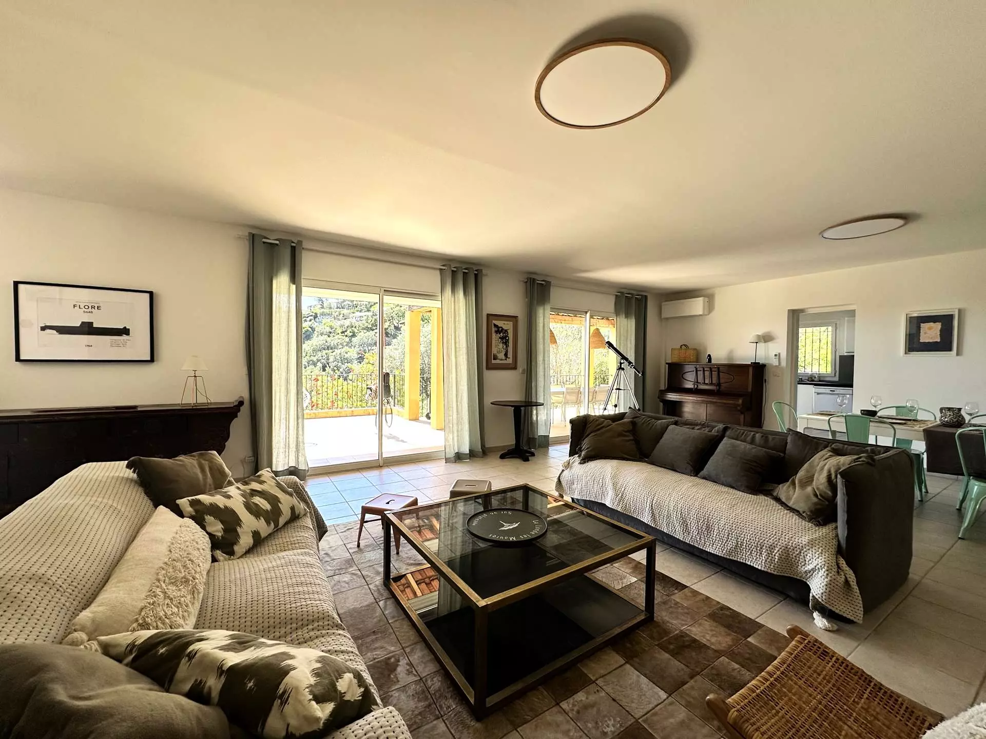 Rez de chaussée : un spacieux séjour/salle à manger climatisé donnant sur une très grande terrasse (80m2) ombragée avec vue sur les collines et le cap des Mèdes de l'île de Porquerolles, avec un coin salon, hamac, fauteuil, et grande table pouvant accueillir les convives à l'ombre tout au long de la journée. La piscine se trouve dans la continuité de la terrasse. Une cuisine séparée et entièrement équipée (lave vaisselle, lave linge, four, micro-ondes, frigo américain, cafetière filtre...), une chambre parentale avec lit Queensize (160*200), salle de douche et accès terrasse. Un WC indépendant.
