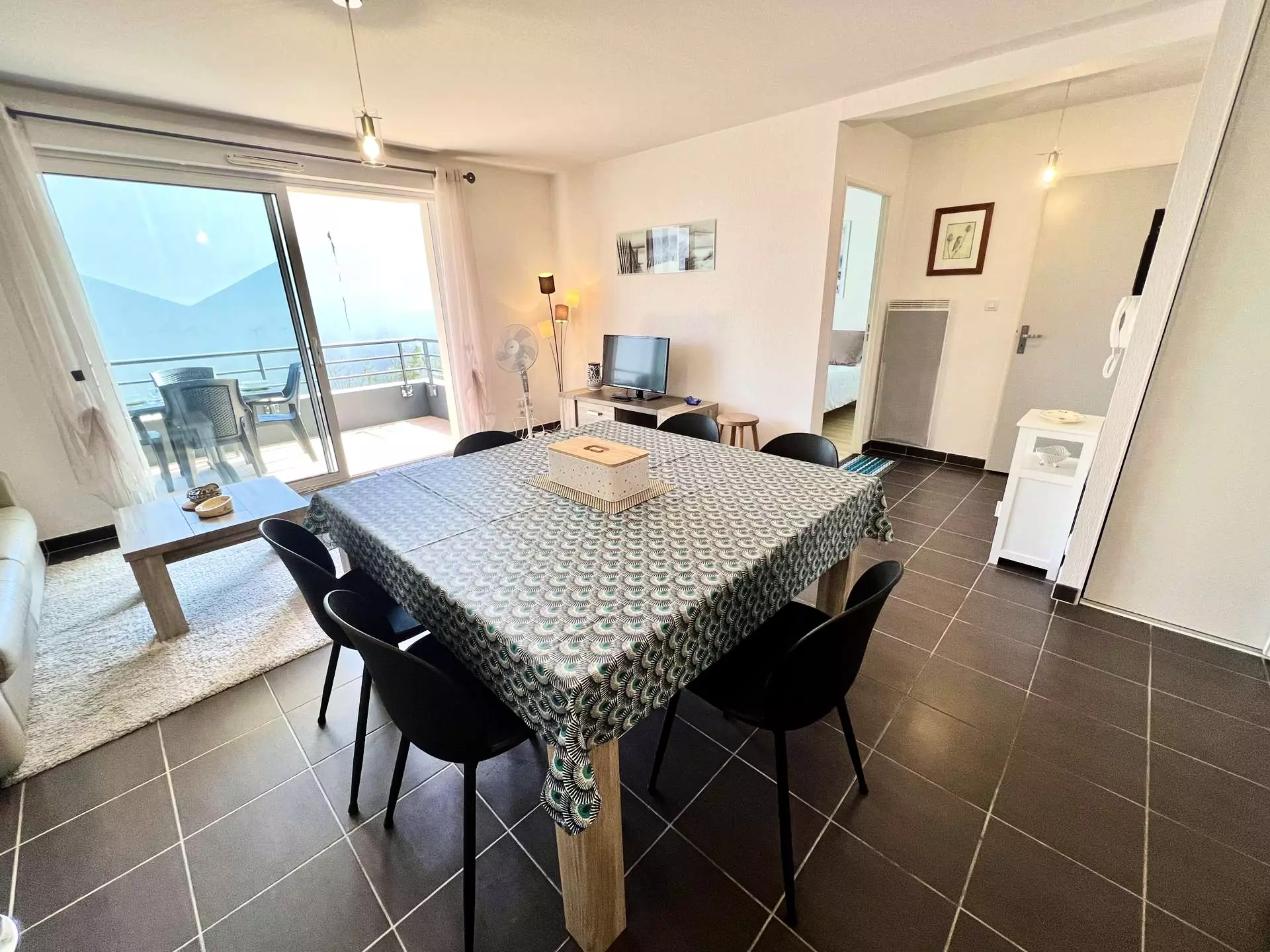 - Séjour avec partie repas (table + chaises) et partie salon (TV, canapé convertible Rapido : couchage 2 personnes, couette), donnant sur le balcon exposé Sud (mobilier de jardin)