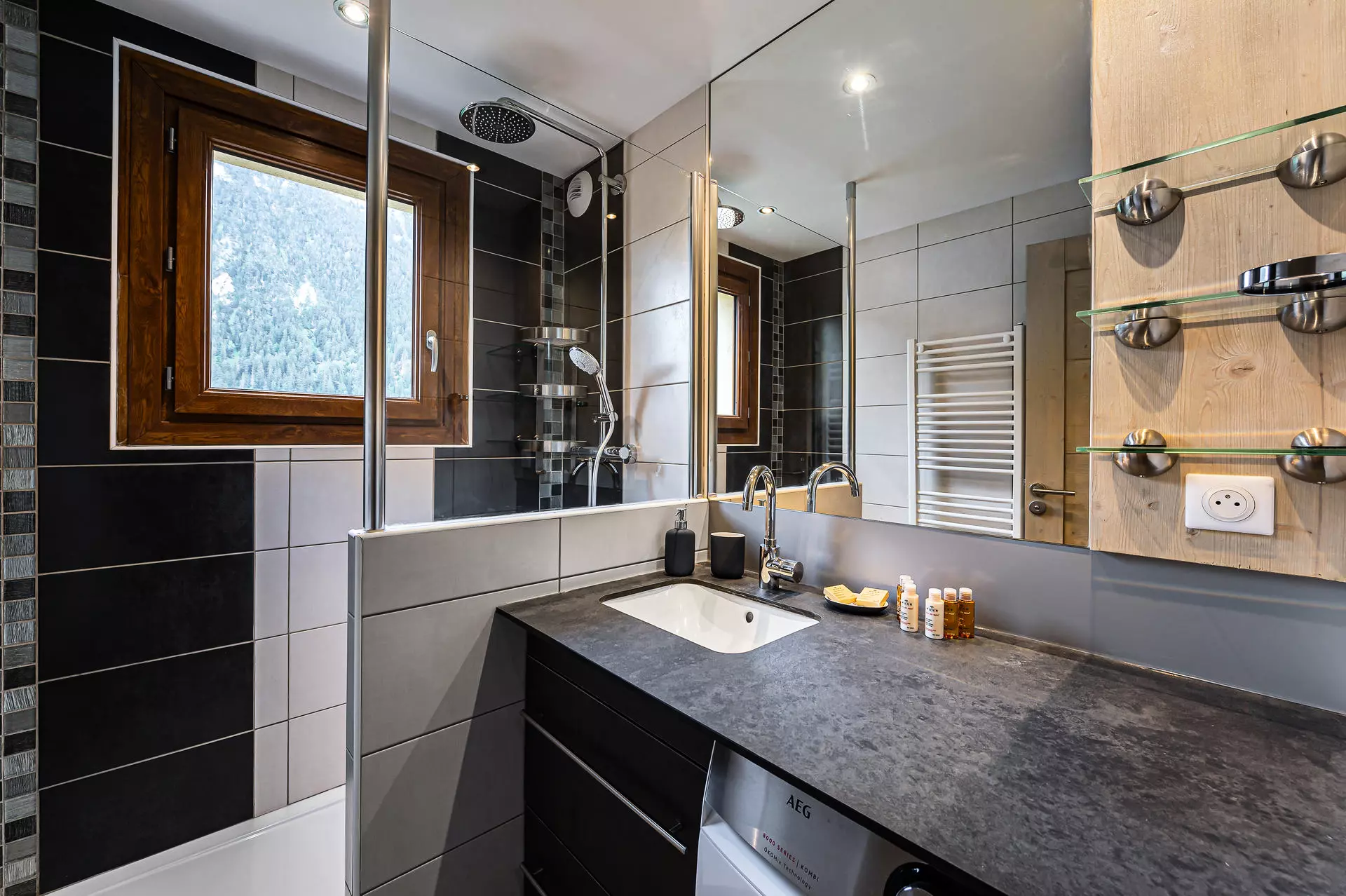- Une salle de douche avec lave-linge séchant