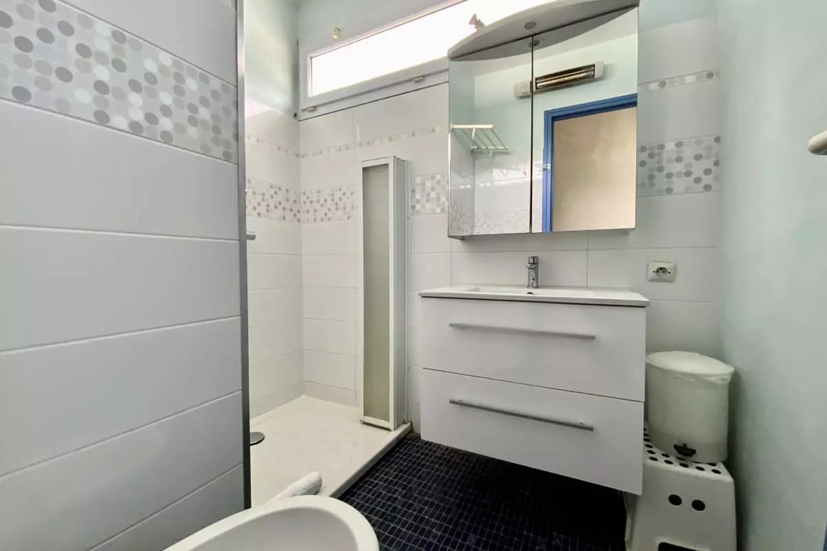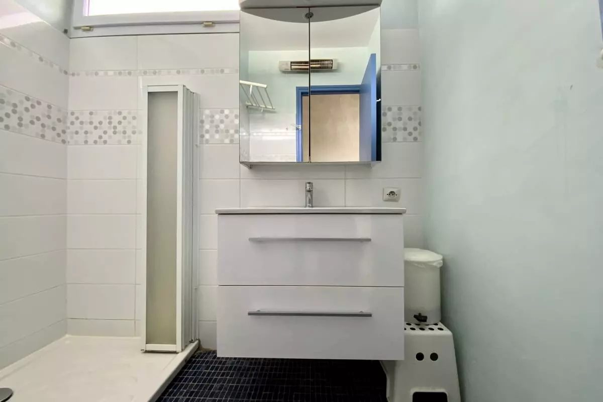 La salle d’eau moderne est dotée d’une douche à l’italienne, et les toilettes sont séparées.