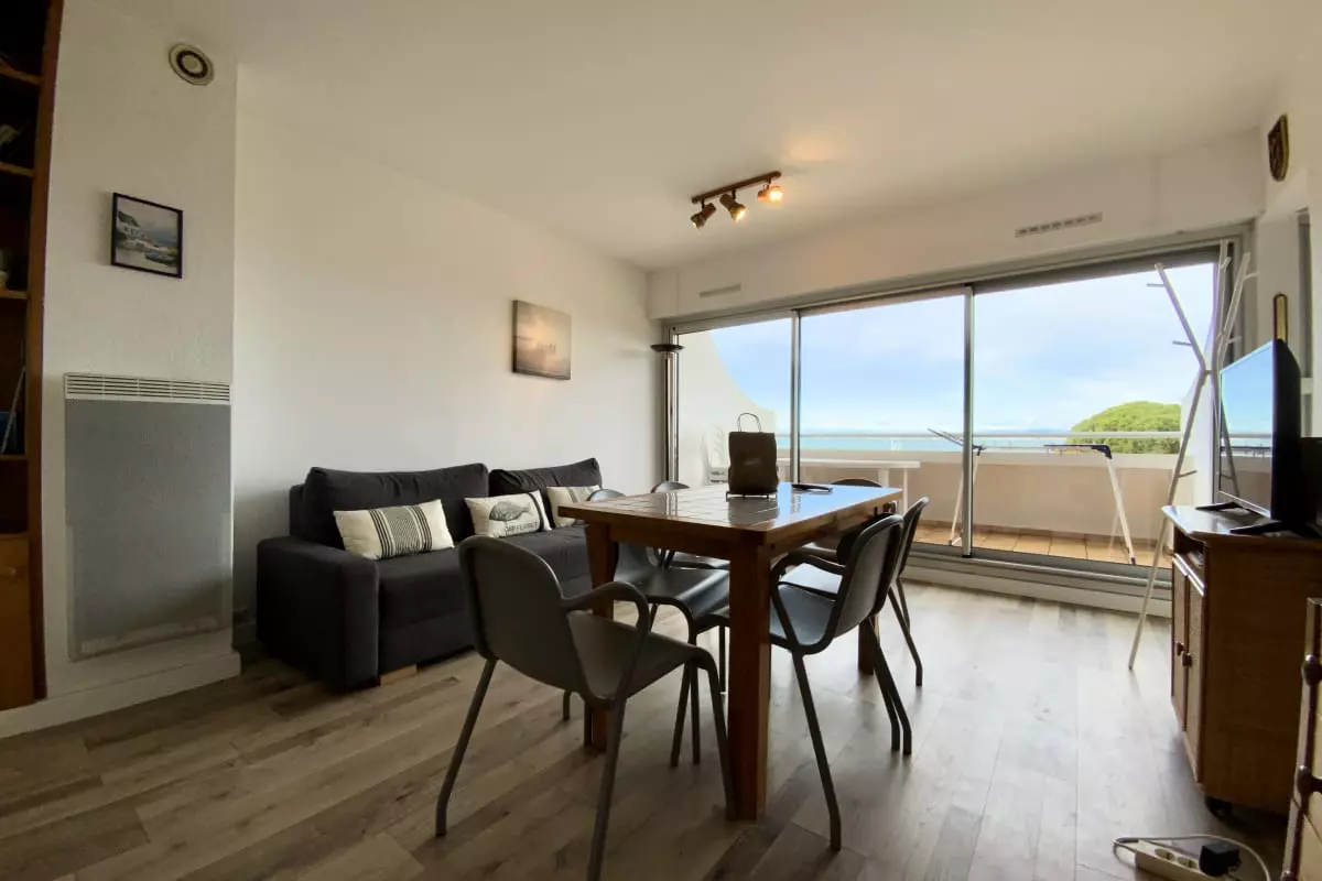 Location vacances à Port Camargue : appartement T3 avec grande terrasse vue mer, 2 chambres, cuisine équipée, climatisation, 2 places de parking. À 50 m de la plage, idéal pour un séjour en famille au Grau du Roi.
