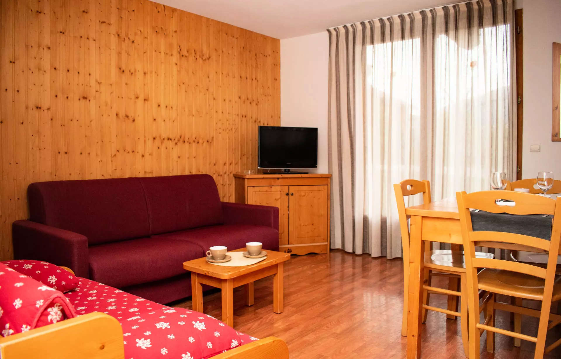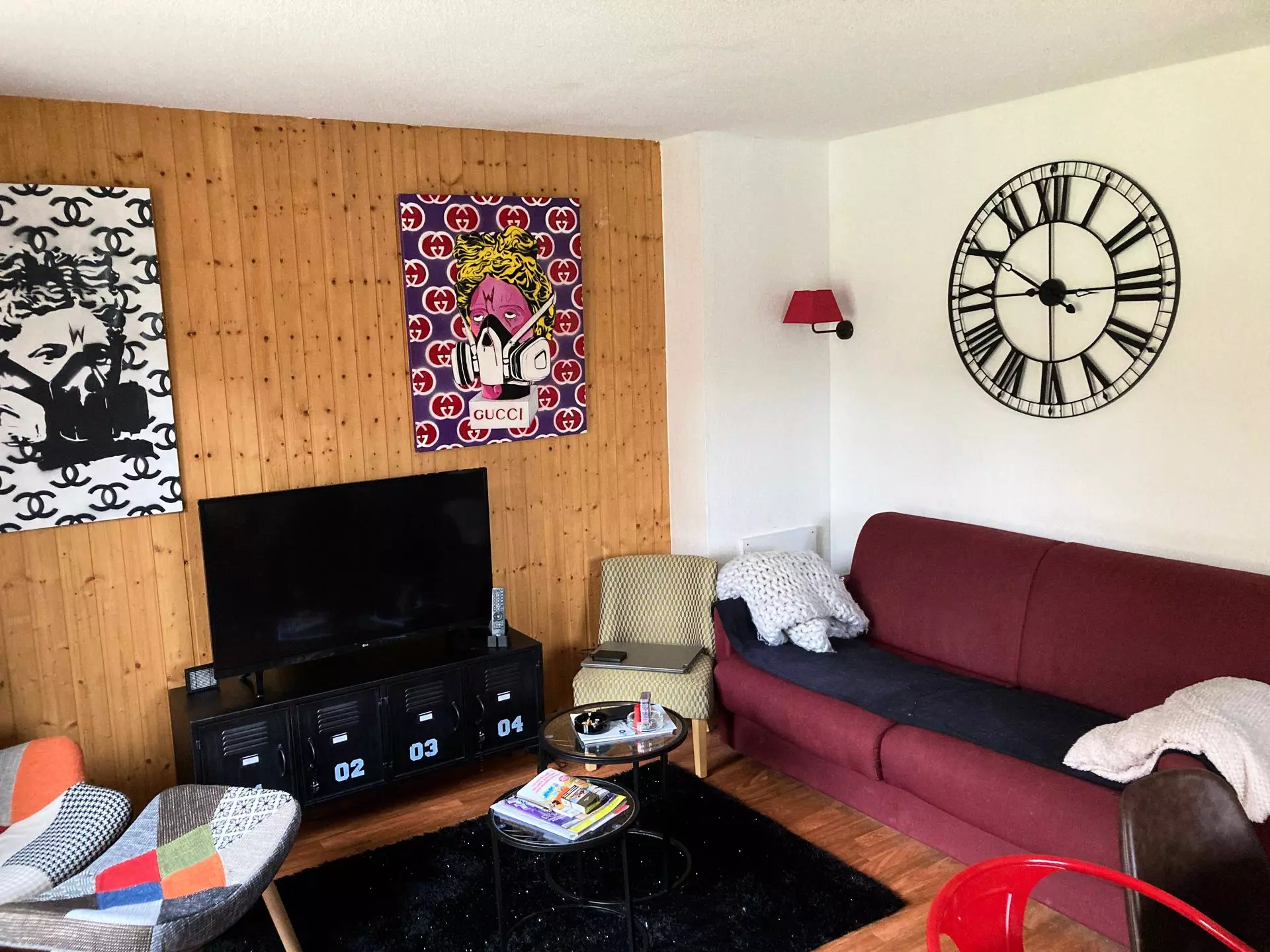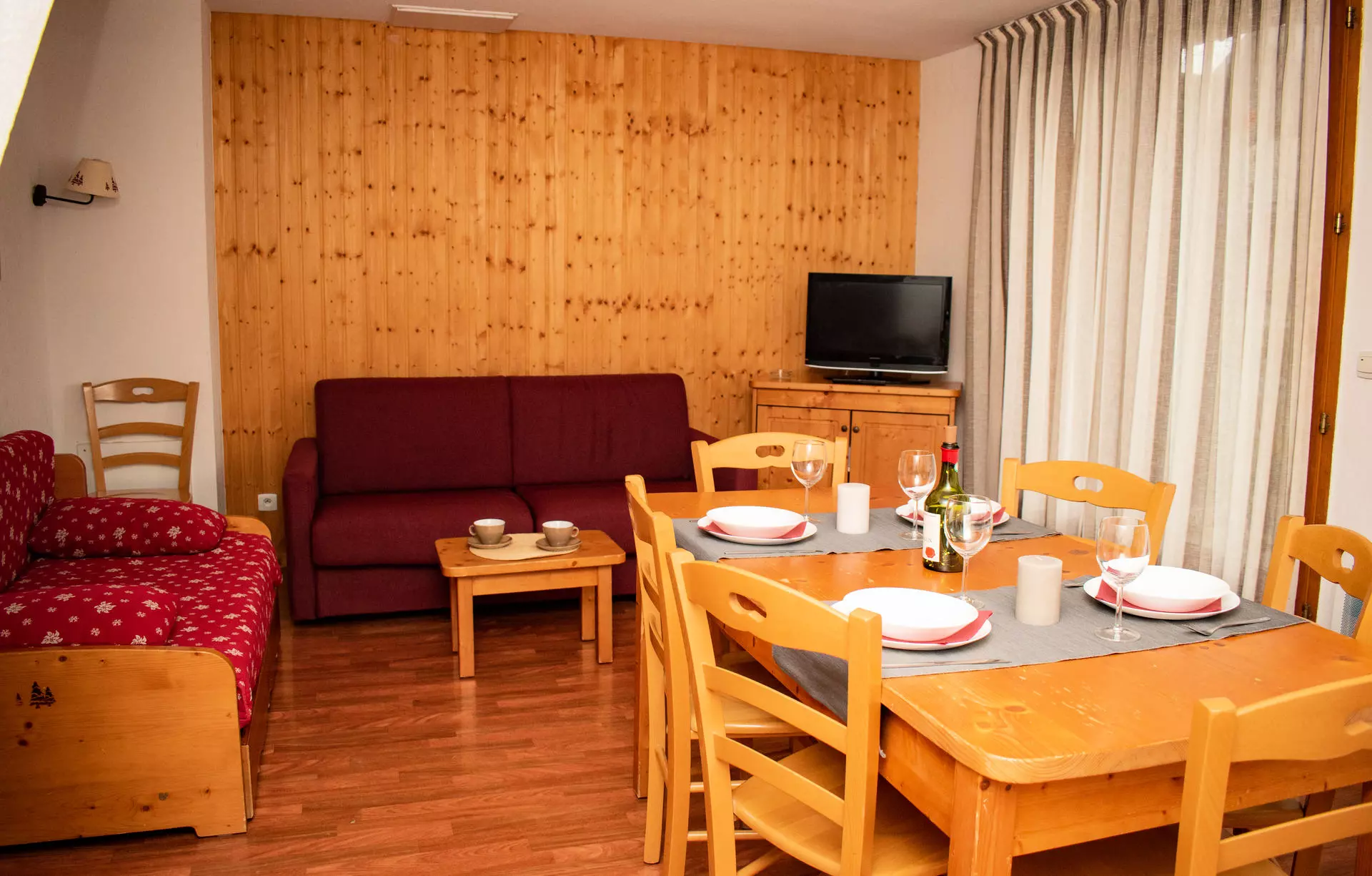 Pièce à vivre avec télévision, canapé-lit ,coin repas.
