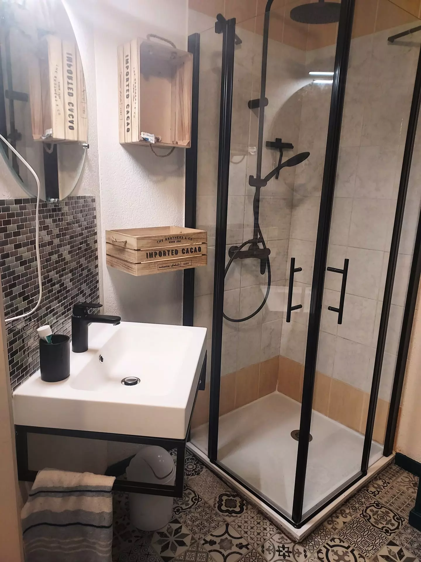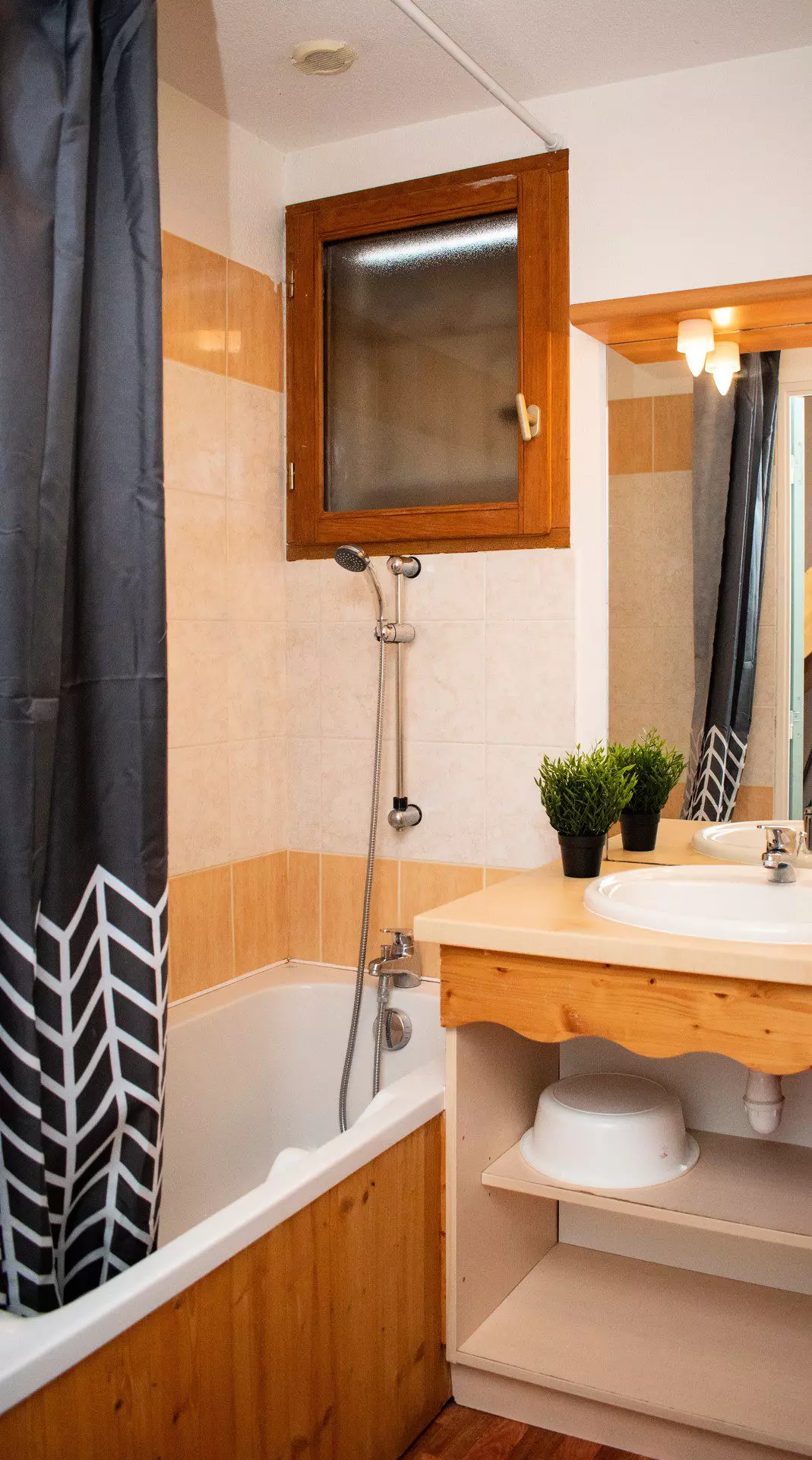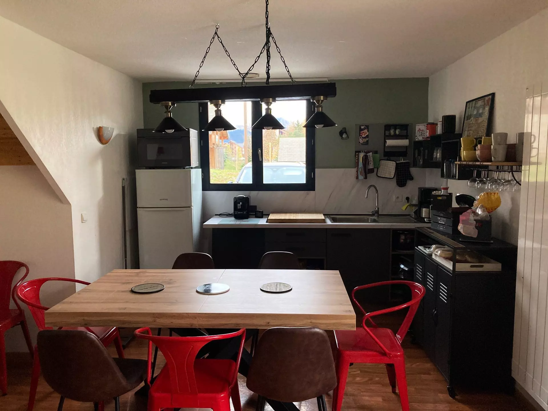 Coin cuisine équipée avec plaques vitro-céramiques, réfrigérateur, lave-vaisselle, micro-ondes, cafetière , grille-pain, nécessaire de vaisselle.Casier à skis.
