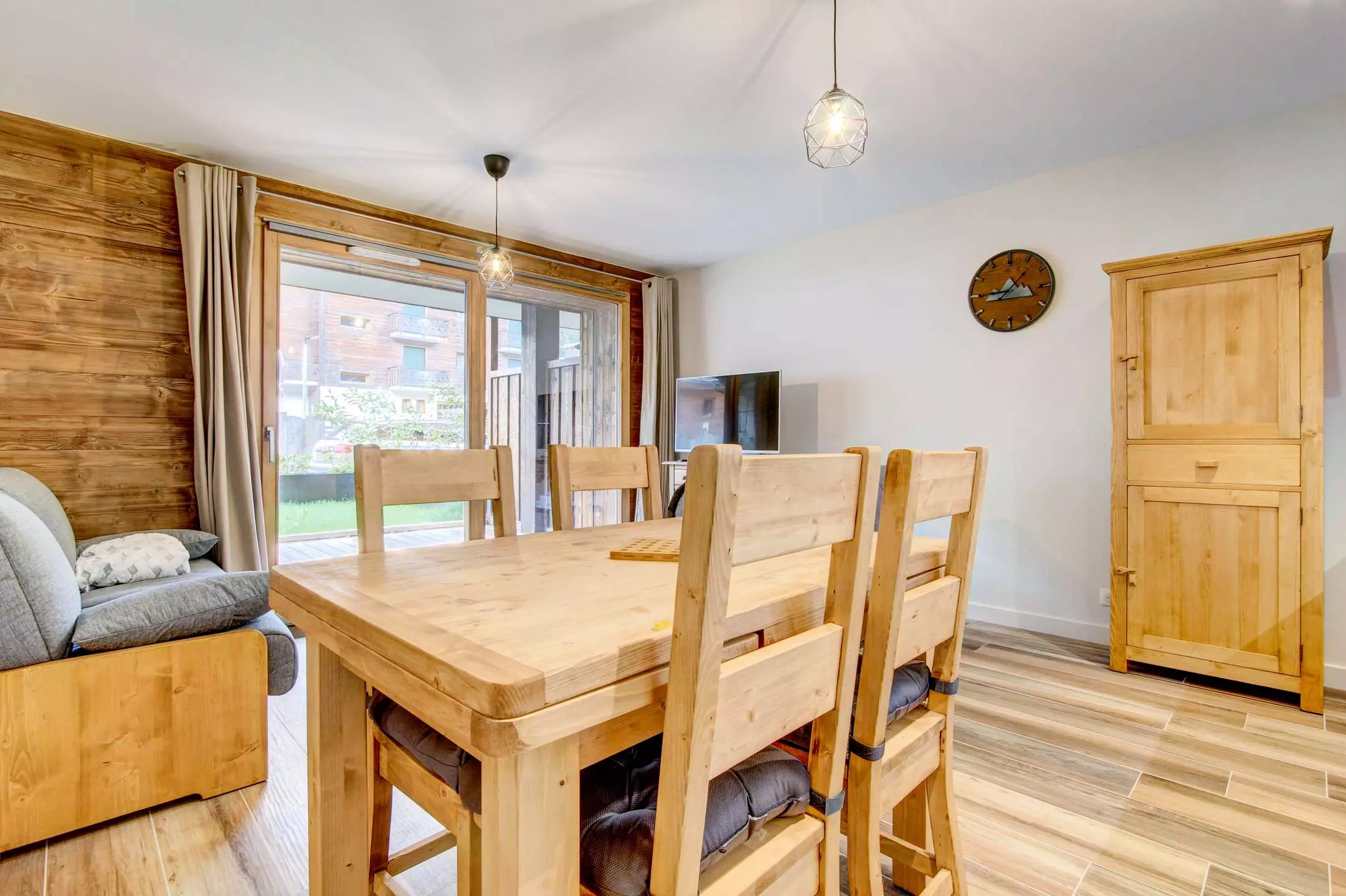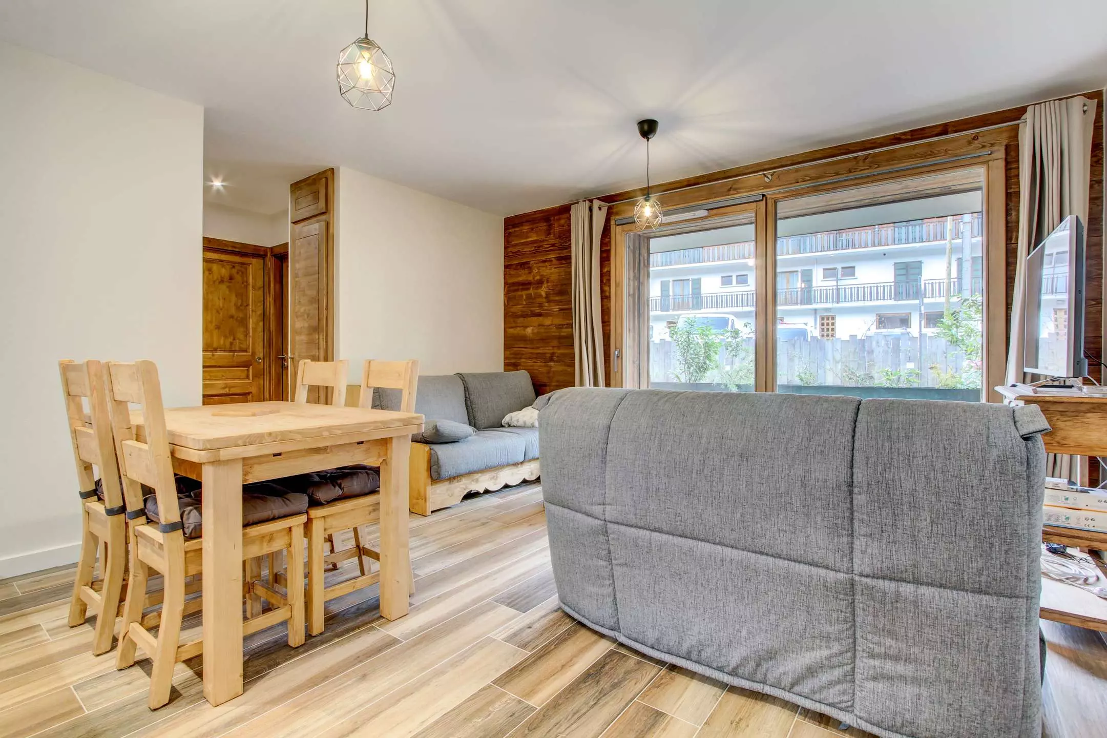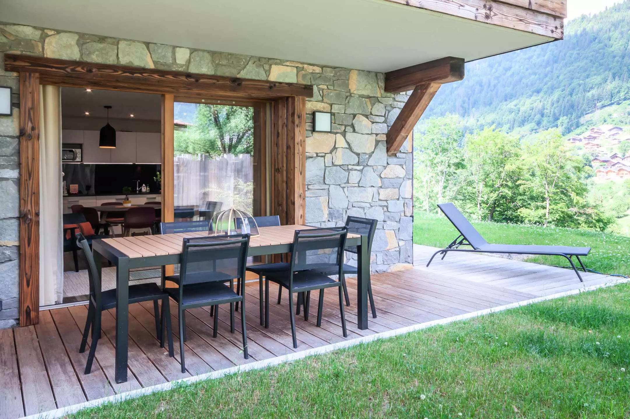 - Pièce à vivre avec coin cuisine ouverte sur le salon/séjour, terrasse avec jardin, vue dégagée sur les montagnes