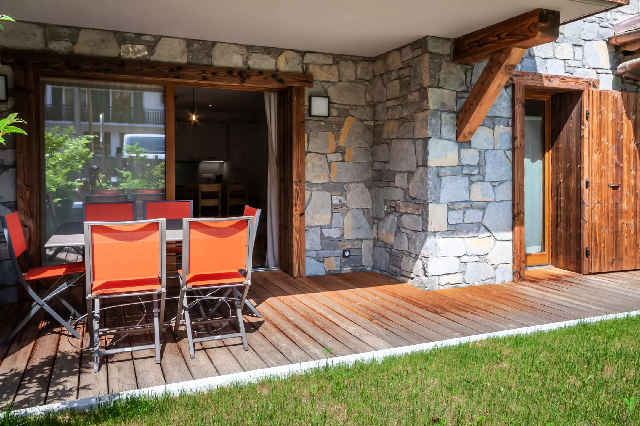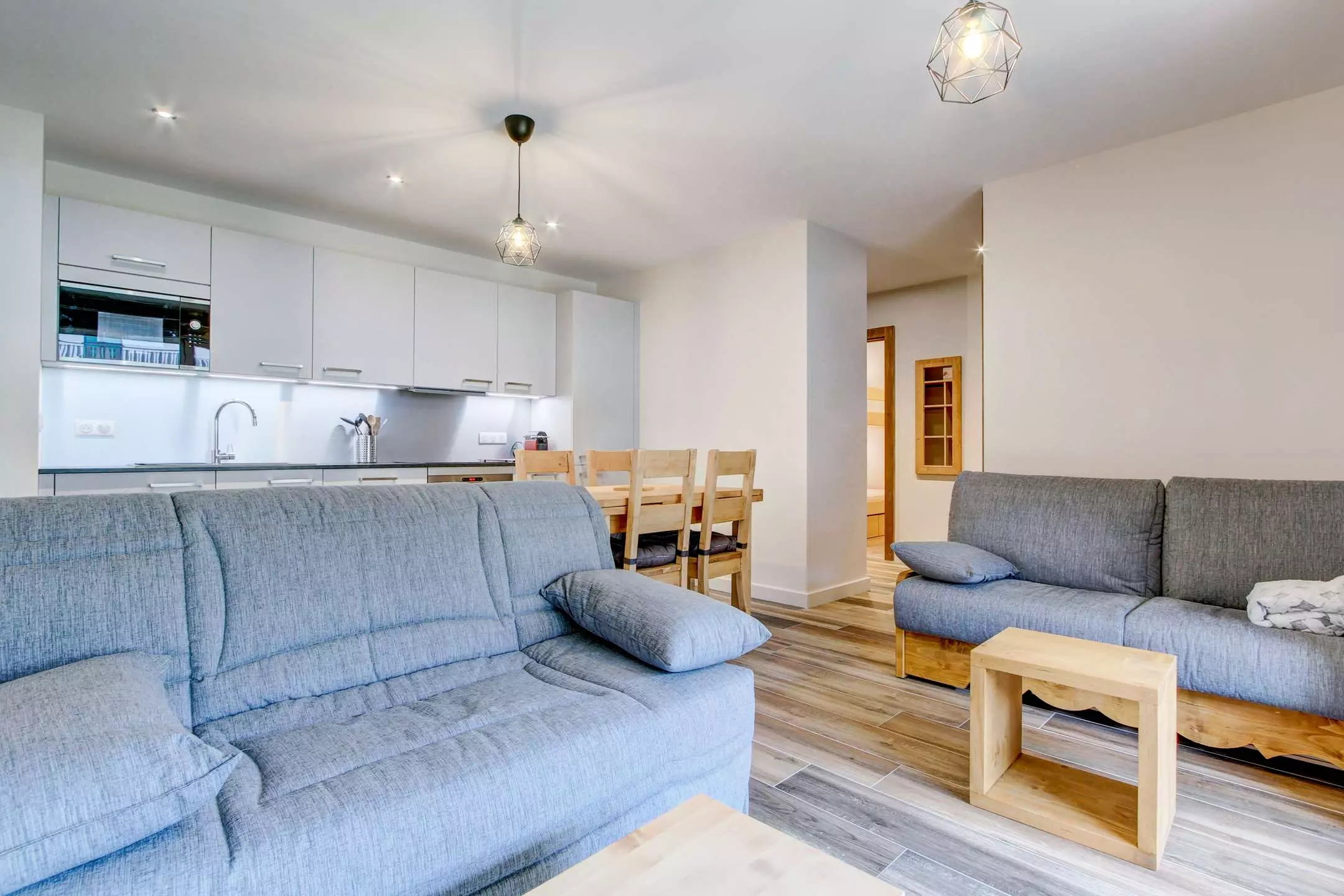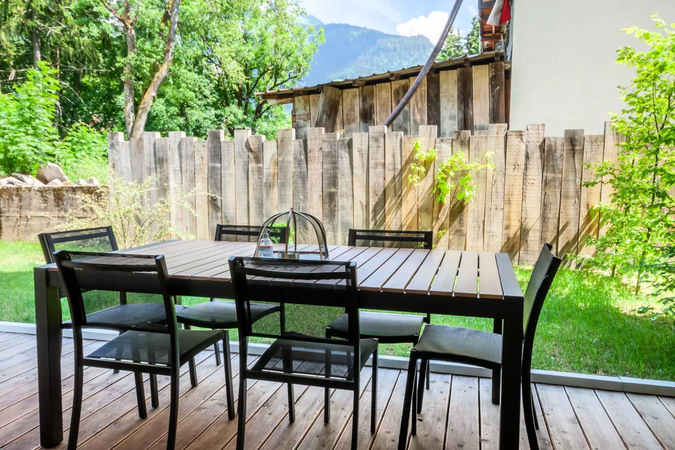 - Pièce à vivre avec coin cuisine ouverte sur le salon/séjour, terrasse avec jardin, vue dégagée sur les montagnes