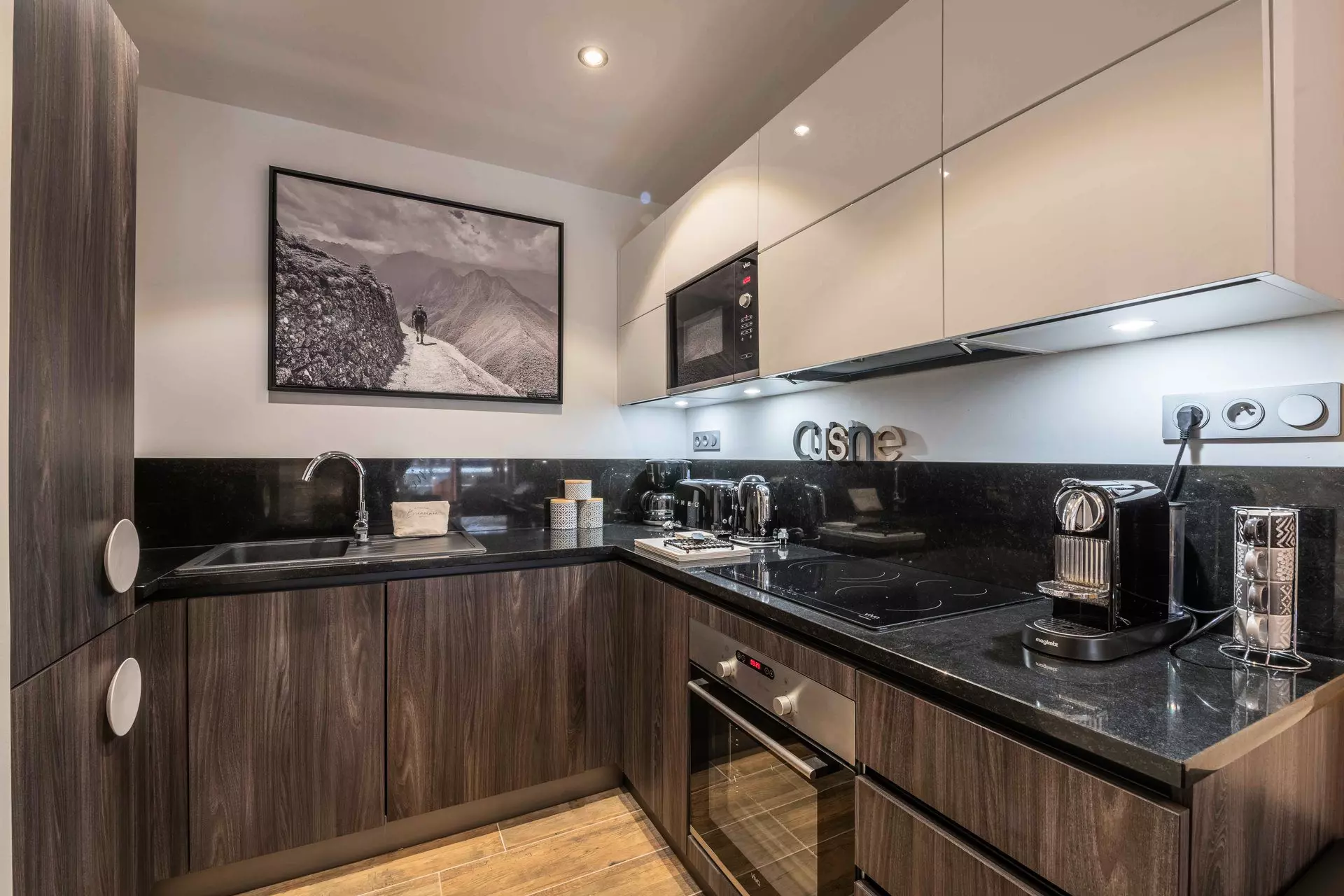 - Cuisine ouverte (lave-linge - séchant, four, micro-onde, cafetière, bouilloire, grille-pain, plaques à induction, réfrigérateur + congélateur)