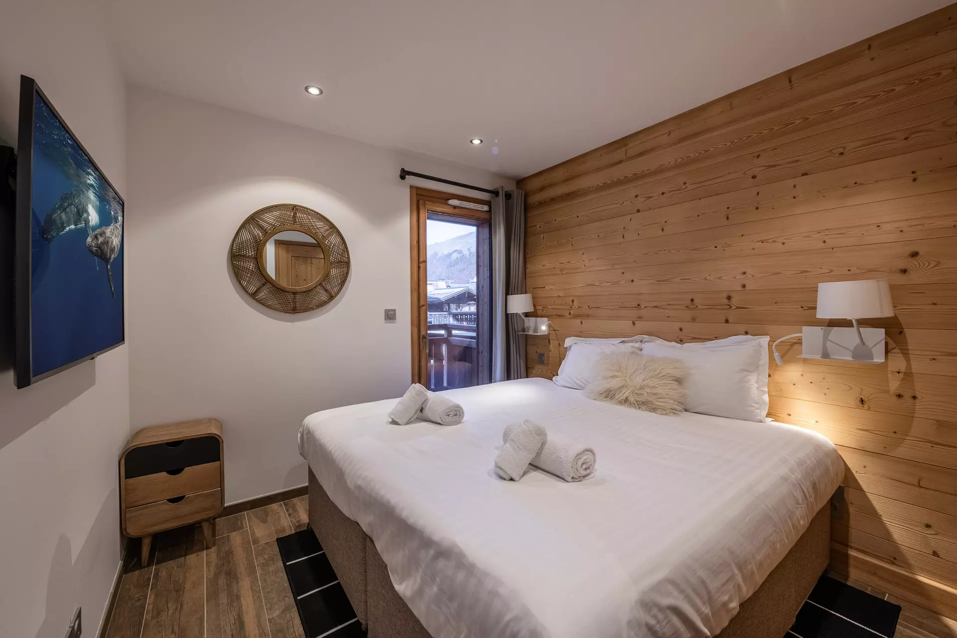 - Chambre 1 : 1 lit double avec rangements, télévision et accès balcon communicatif avec la seconde chambre