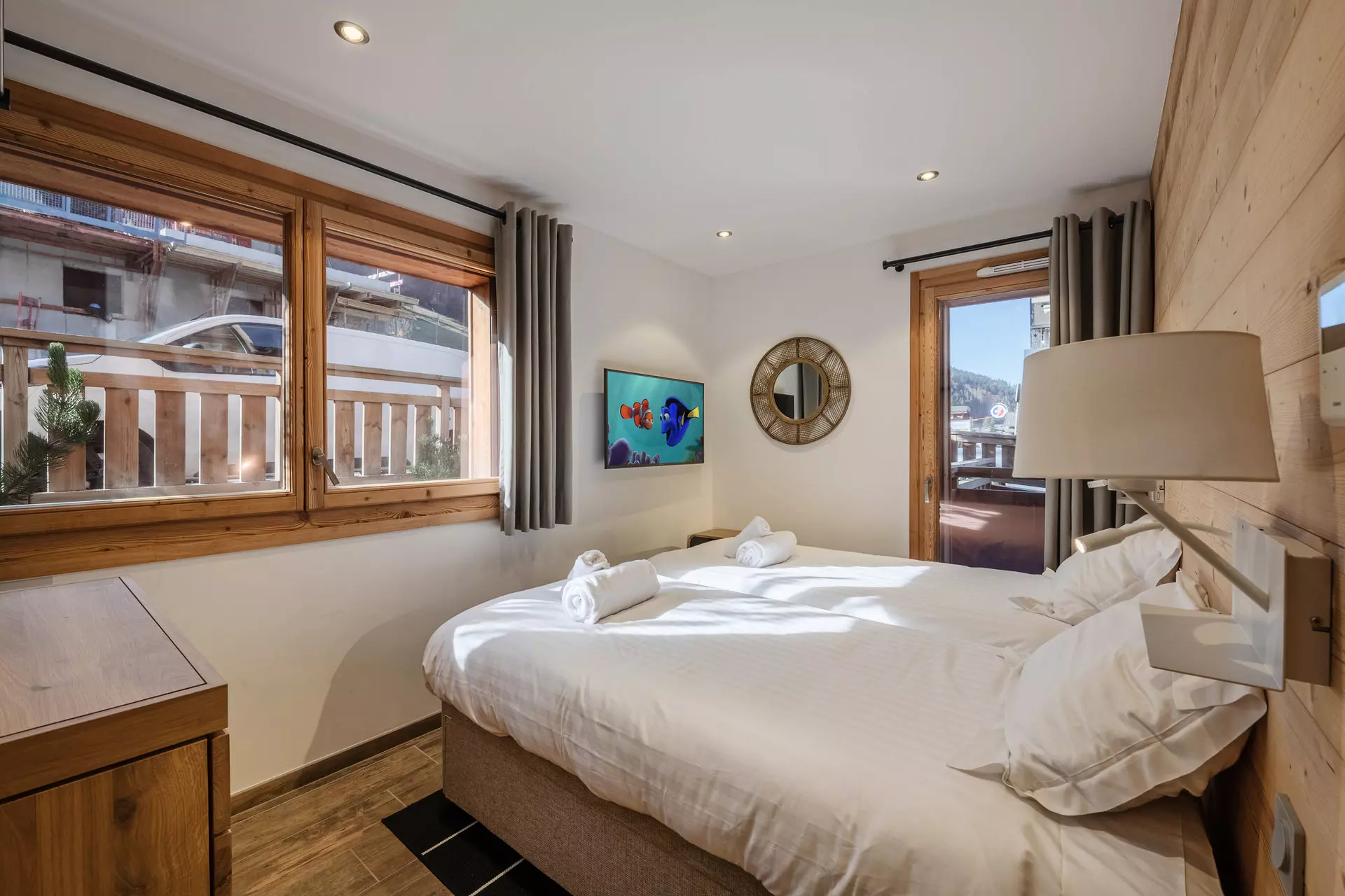 - Chambre 2 : 2 lits simples avec rangements, télévision avec accès balcon