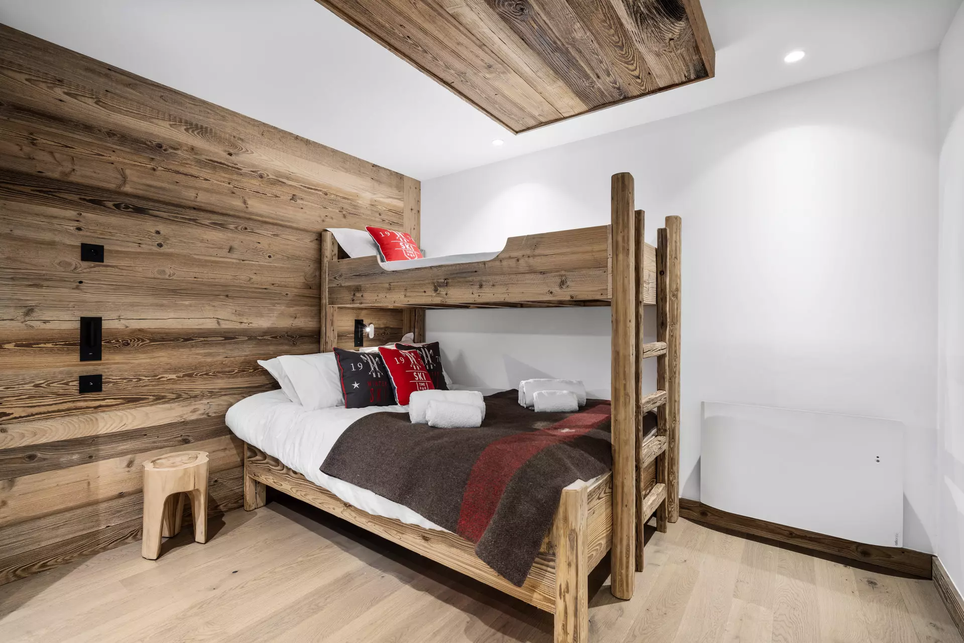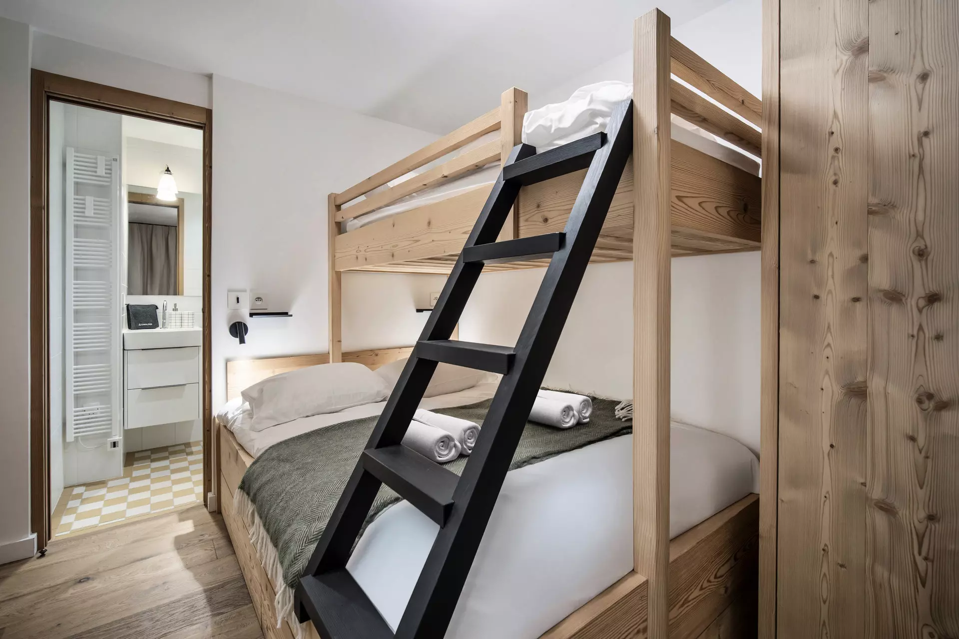 - Une chambre avec un lit superposé : un lit simple en haut et un lit double en bas en suite