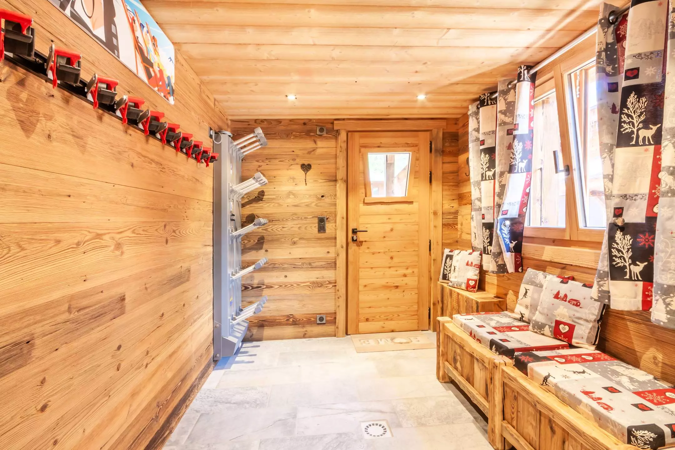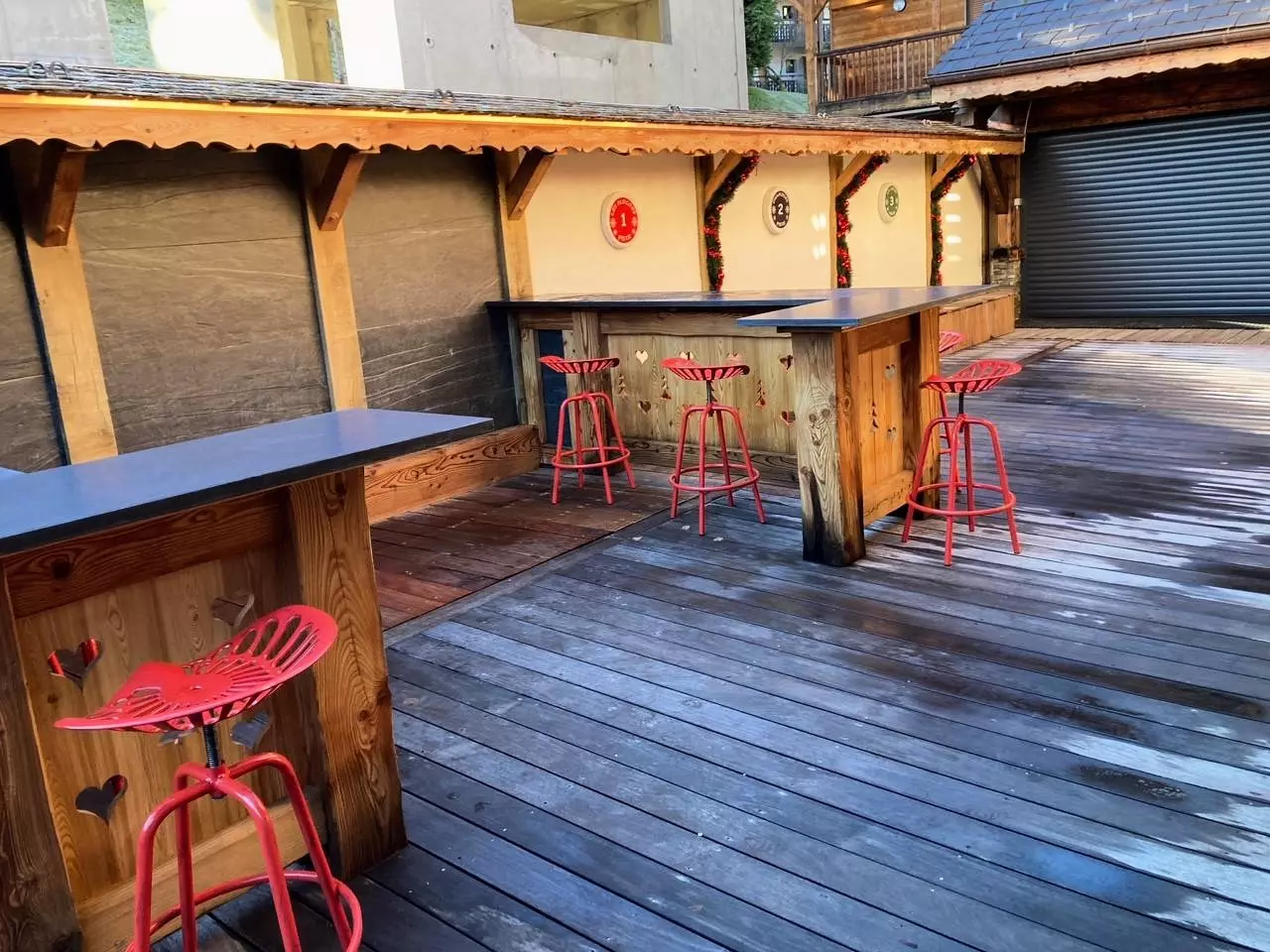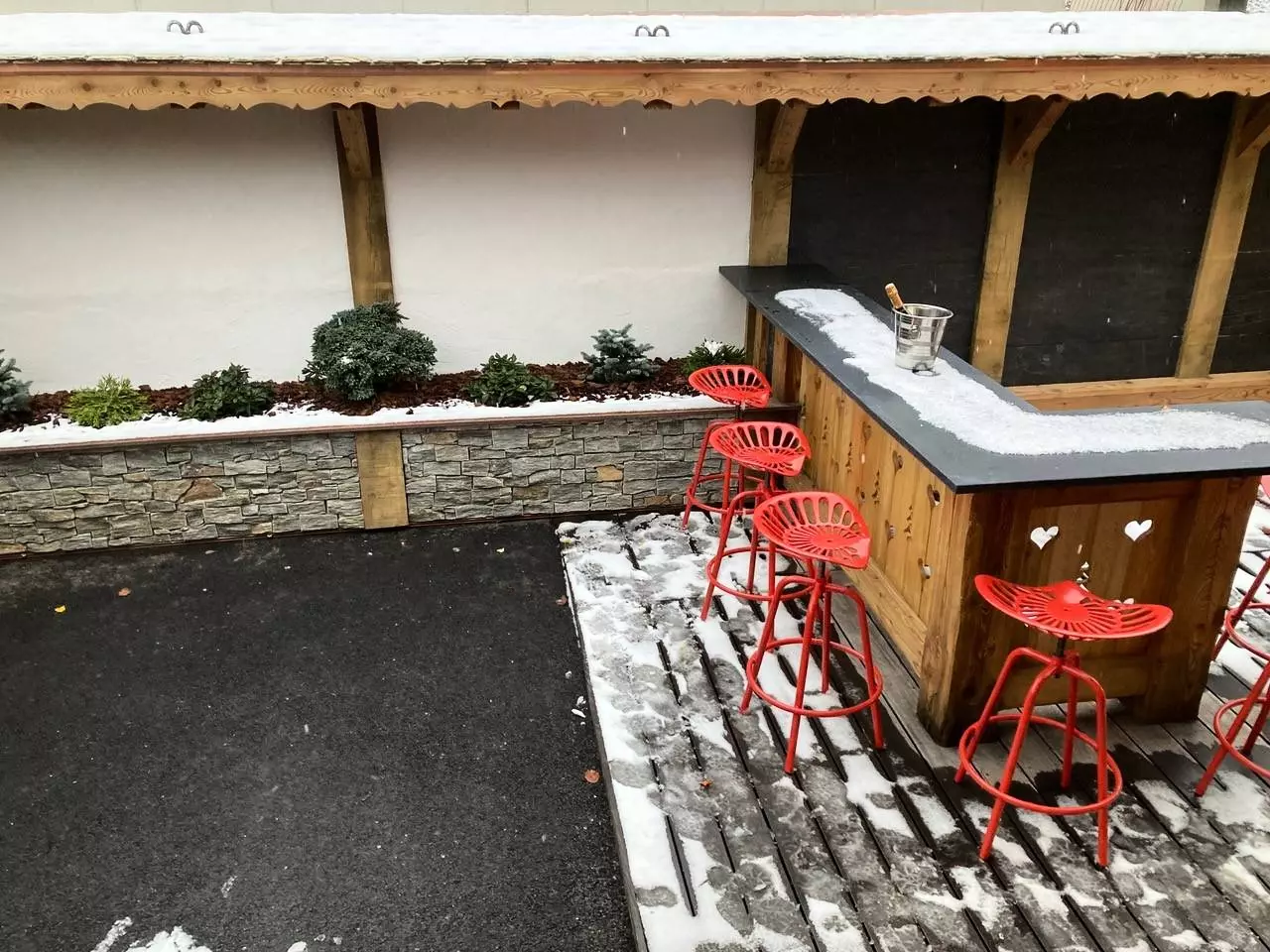 RDC: Entrée avec placard, Cuisine équipée ouverte sur salle à manger, accès à la grande terrasse et espace extérieur avec bains à remous, Chambre double (160x200) avec tv, douche et lavabo, Ski room avec sèche-chaussures, WC