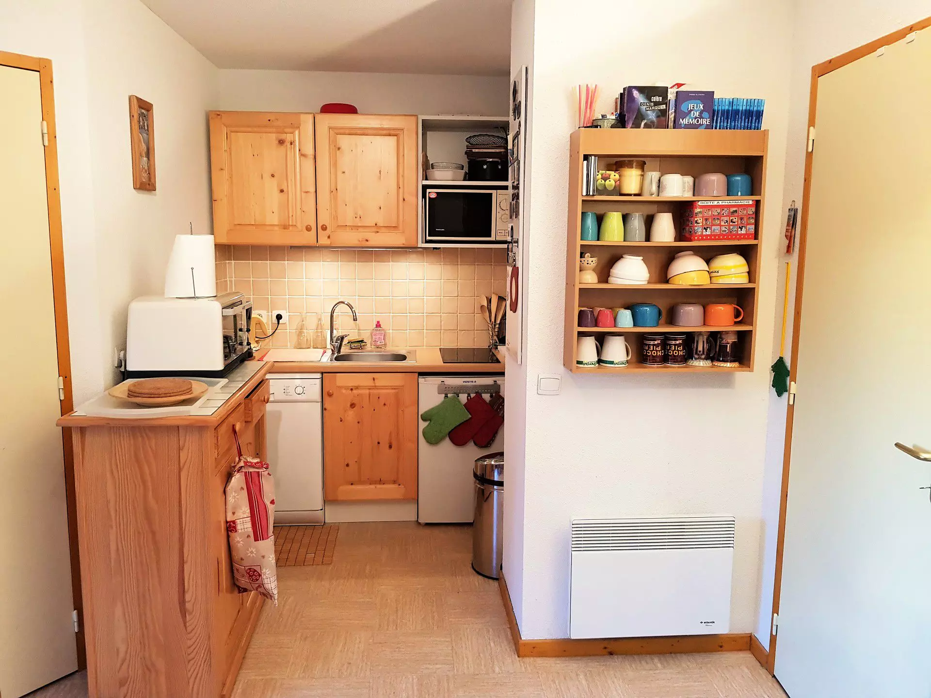 Coin cuisine équipé avec plaques vitro-céramiques, réfrigérateur, micro-ondes, four, lave-vaisselle, cafetière à filtre, bouilloire, appareil à raclette, nécessaire de vaisselle, aspirateur.