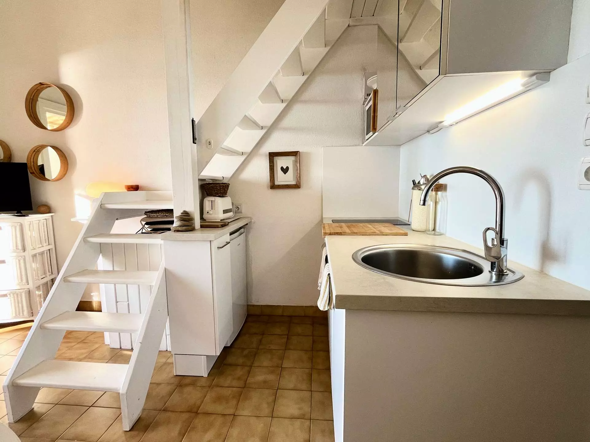 La cuisine est fonctionnelle attenante au séjour, une chambre avec un lit double pour deux personnes, salle de douche et wc indépendant.