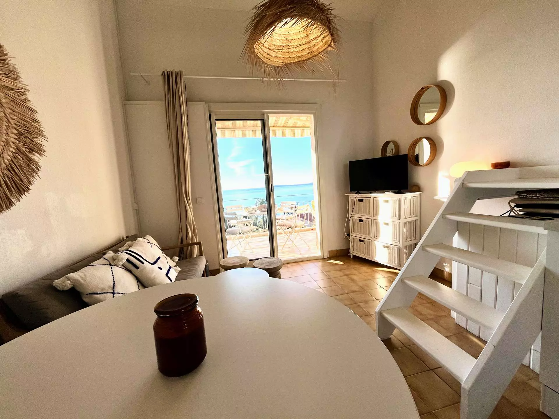 Cet appartement de vacances en rez-de-chaussée avec une terrasse vue mer, composé d'une entrée, un séjour équipé d'un canapé convertible pour deux personnes donnant sur la terrasse d'où l'on peut admirer une vue mer magnifique.