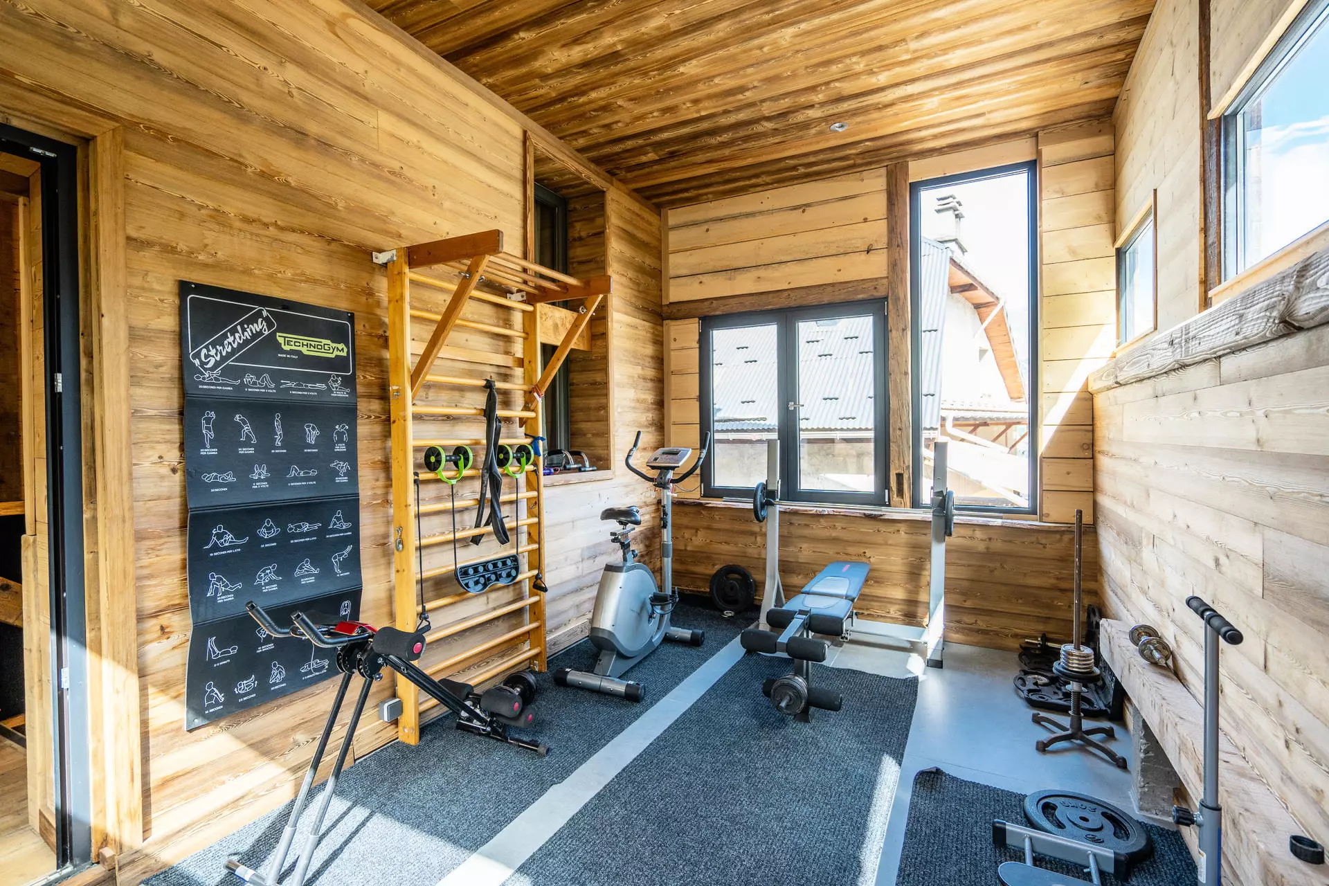 Une salle de sport vitrée offrant une vue magnifique sur l'extérieur.