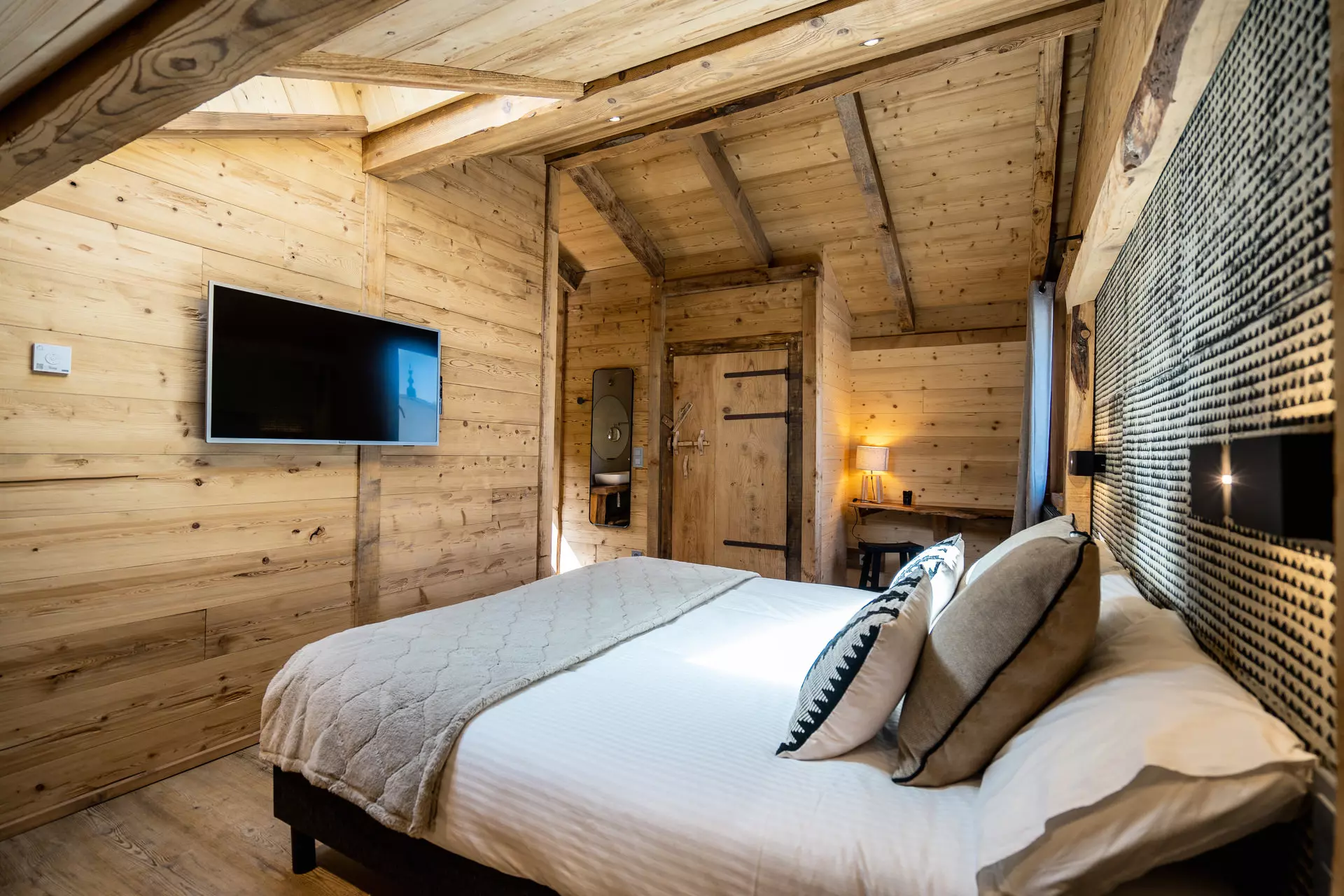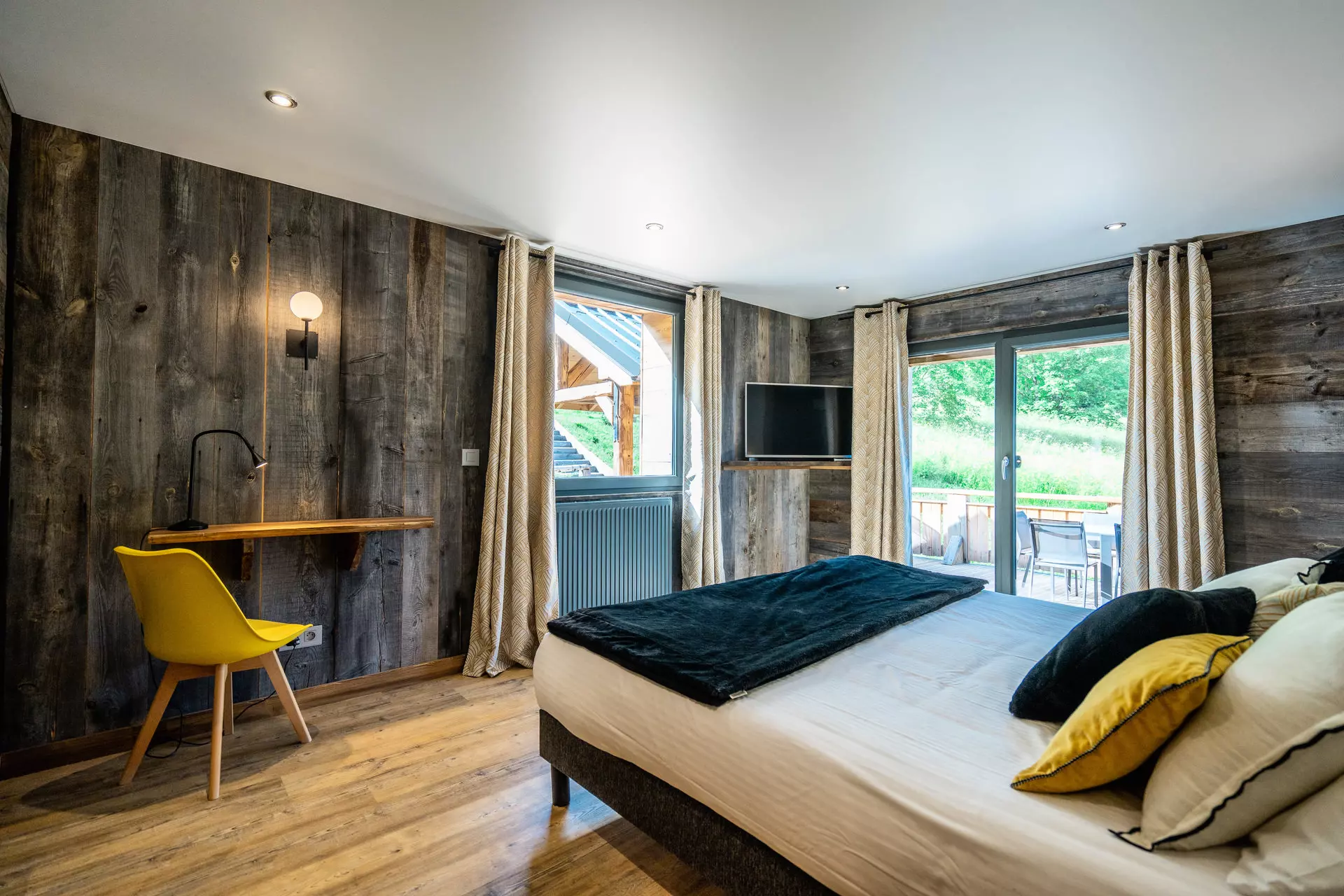 Une chambre double avec salle de douche et toilette donnant sur la terrasse avec bains à remous équipée d'une TV.