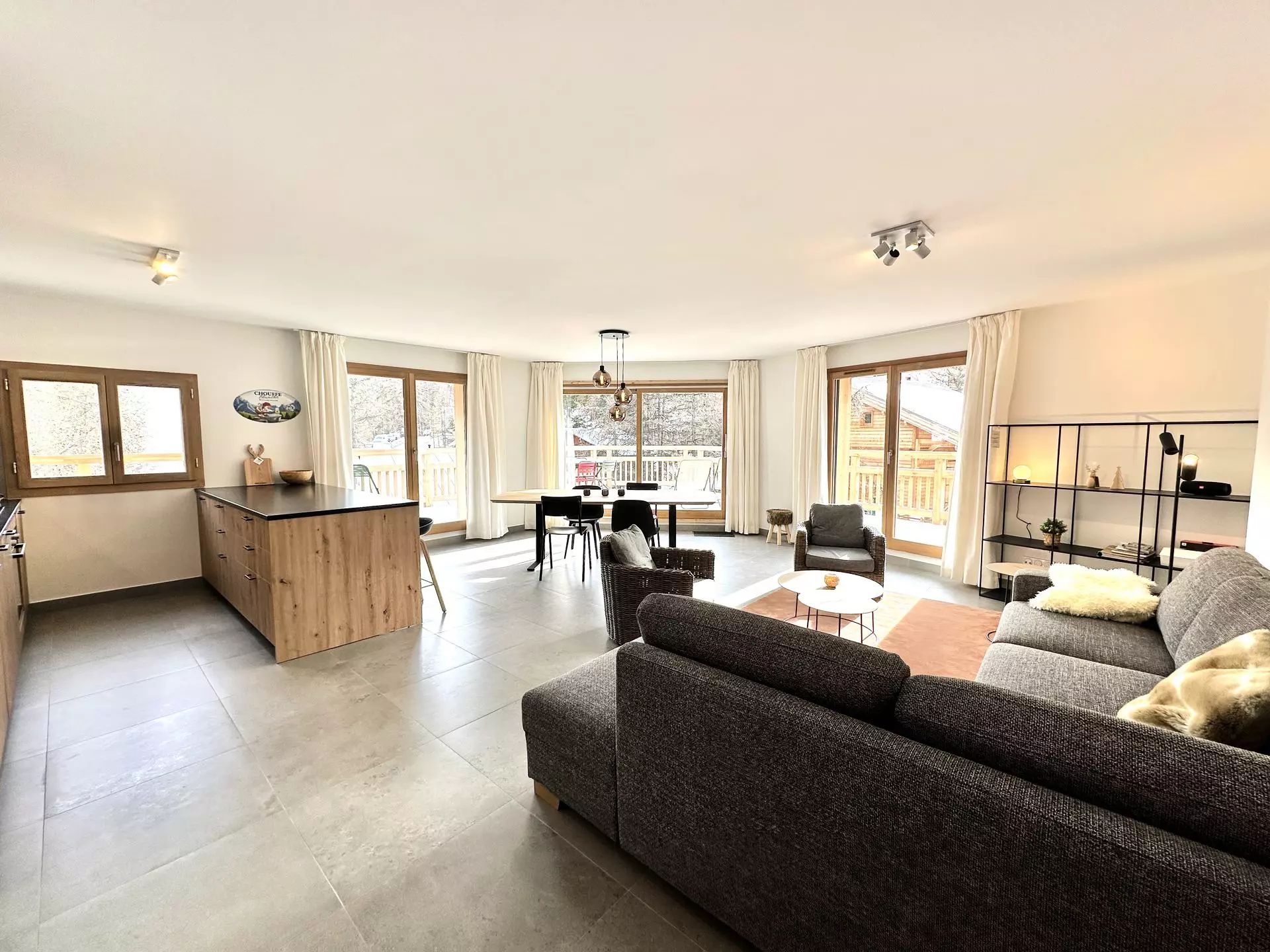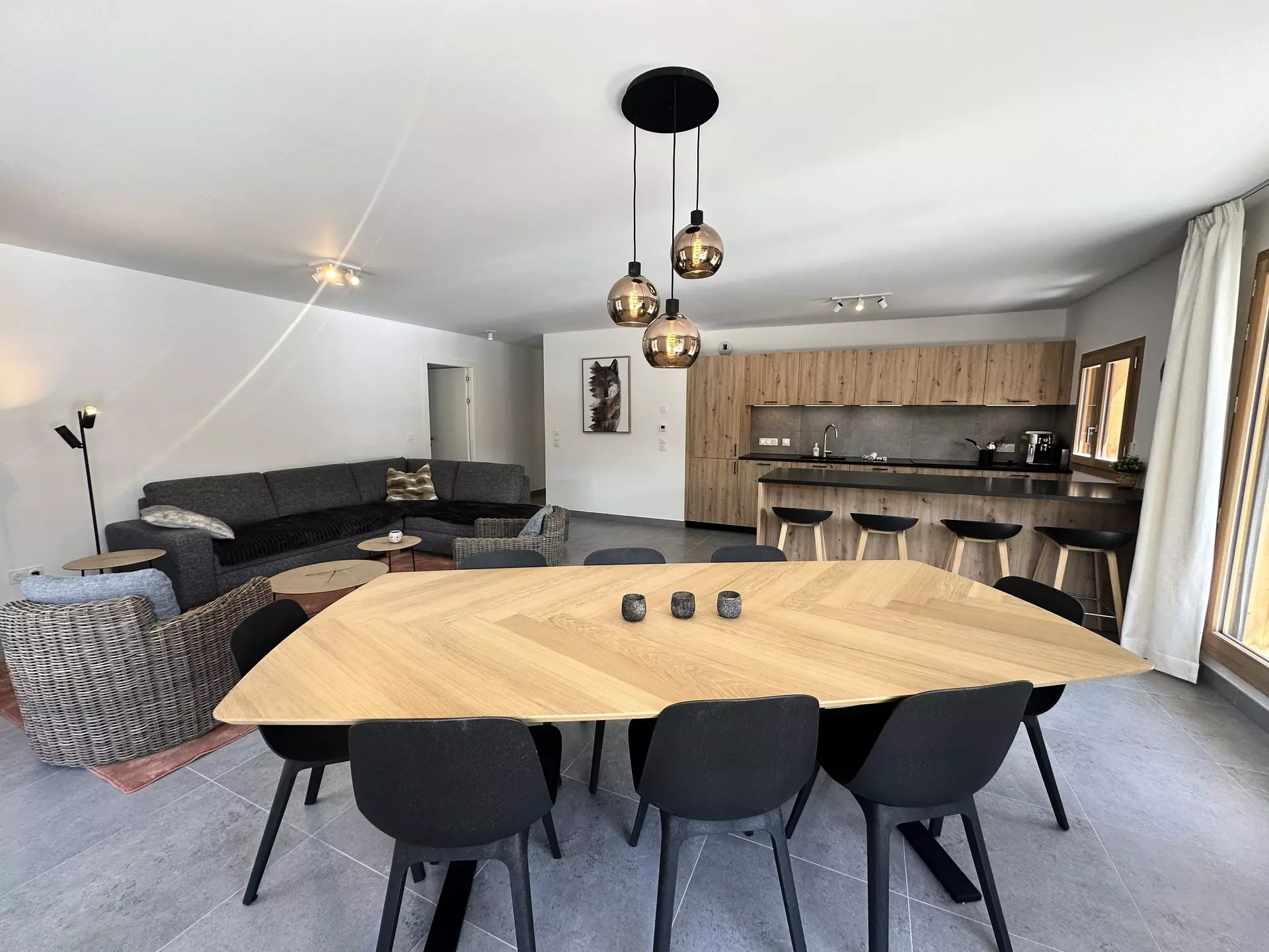 Spacious living area with a fully equipped open-plan kitchen featuring a conventional oven, microwave oven, induction hob, dishwasher, fridge-freezer, kettle, toaster, raclette and fondue sets, and a Smeg coffee machine.