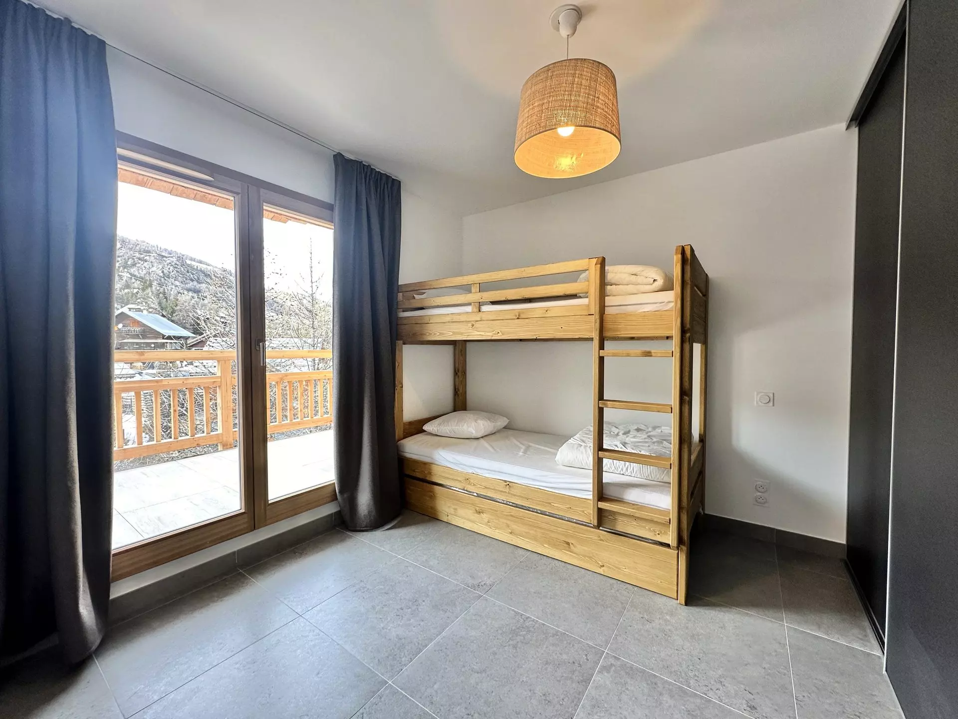 L'espace nuit comprend une chambre avec des lits superposés, une deuxième chambre avec deux lits en 90 cm pouvant être rapprochés pour créer un lit double, et une troisième chambre équipée de trois lits en 90 cm, également modulables en lit double. L'appartement dispose également d'une salle d'eau moderne et chaleureuse, ainsi que de WC séparés.
