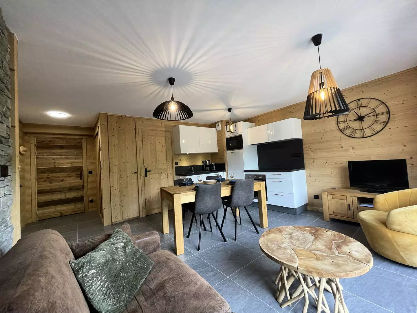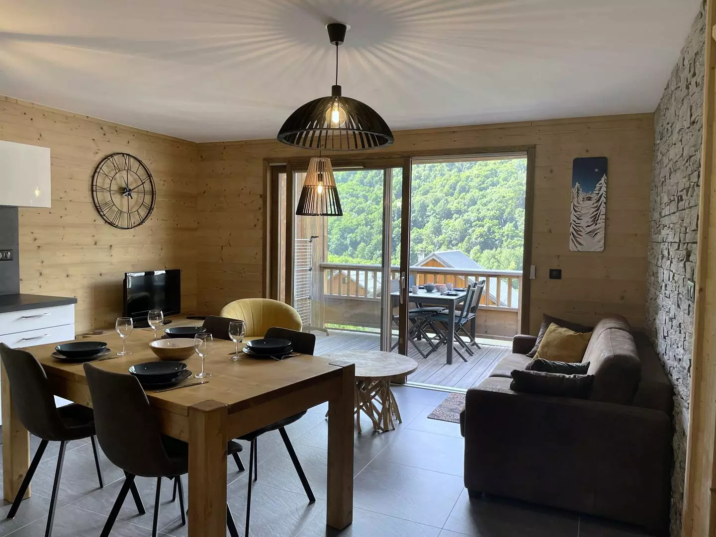 La pièce de vie propose un coin salon chaleureux avec TV, une salle à manger et une cuisine entièrement équipée.