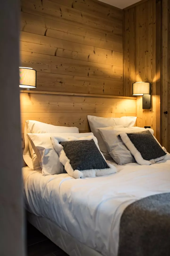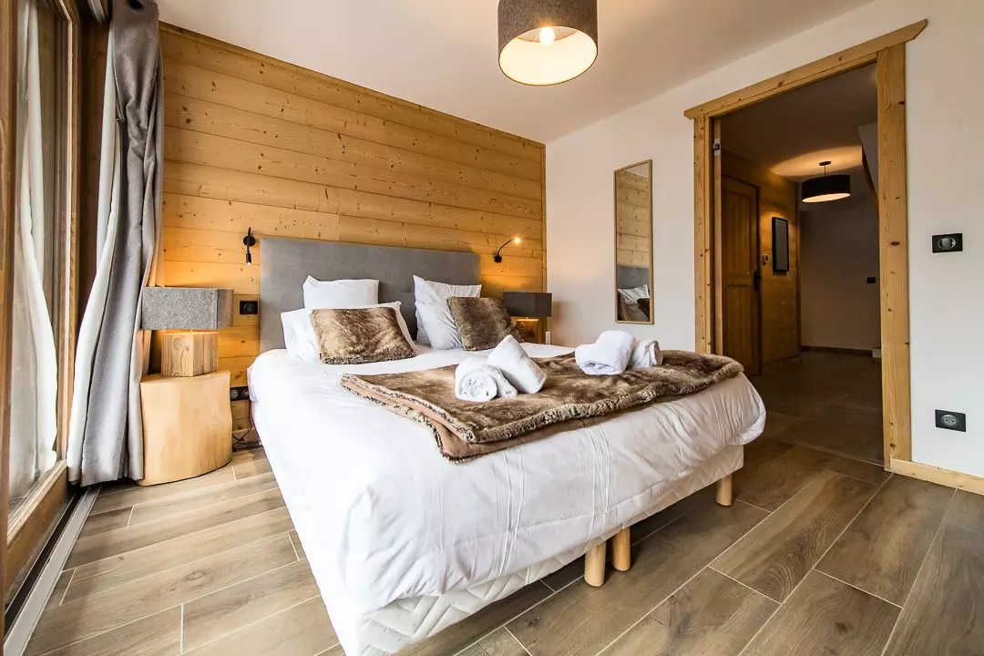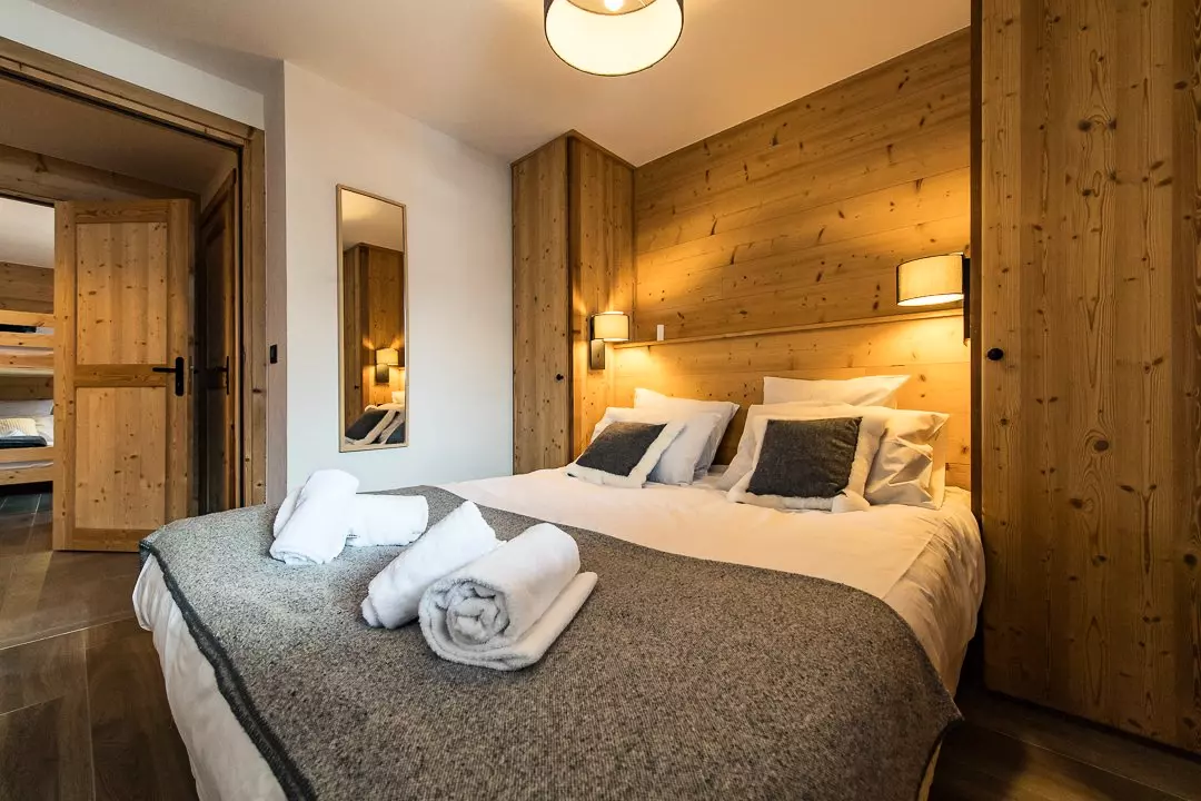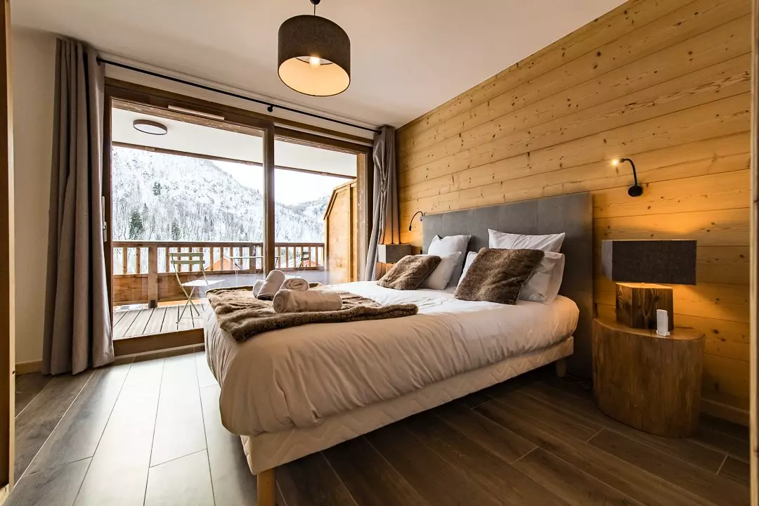 La première chambre propose un lit en 160 cm et ouvre sur une terrasse privative exposée plein sud avec vue sur le village et les Aiguilles d'Arves.