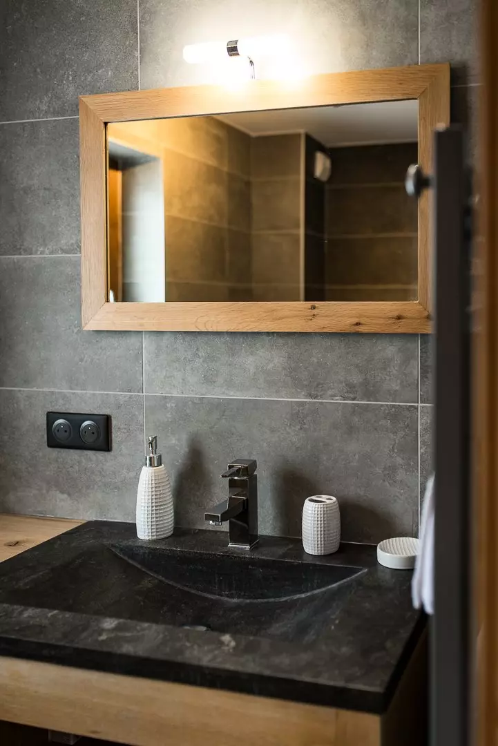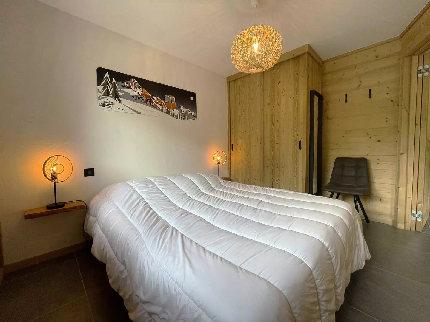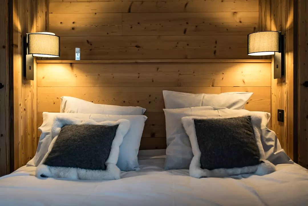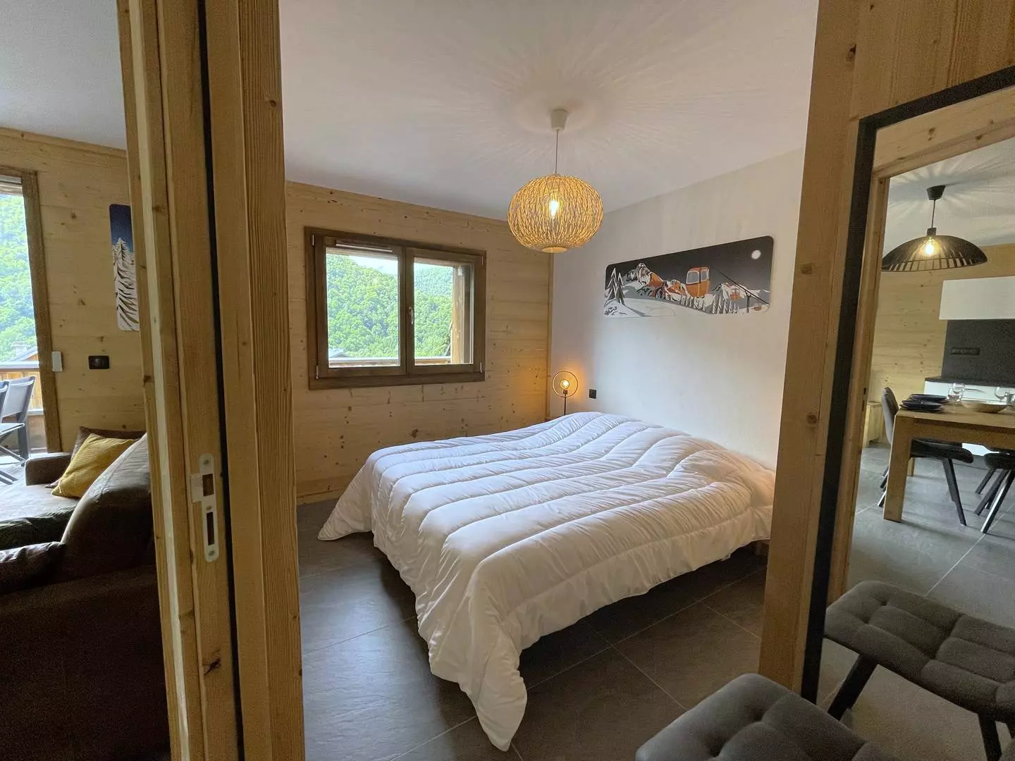 La première chambre propose un lit en 160 cm et ouvre sur une terrasse privative exposée plein sud avec vue sur le village et les Aiguilles d'Arves.