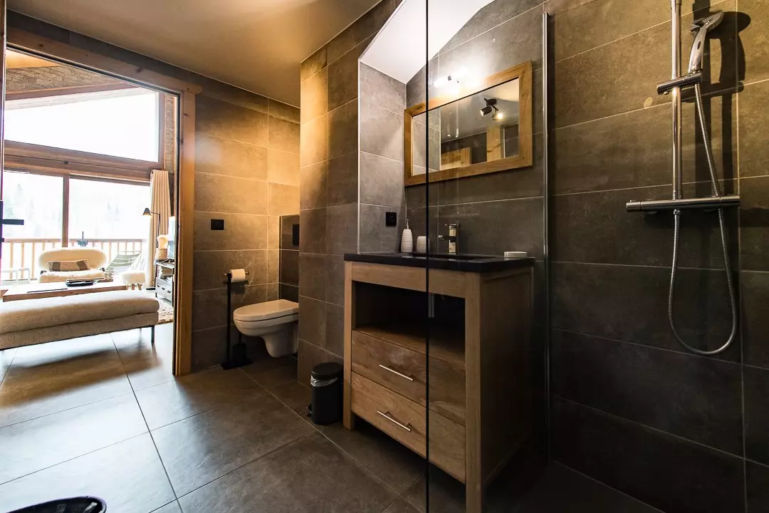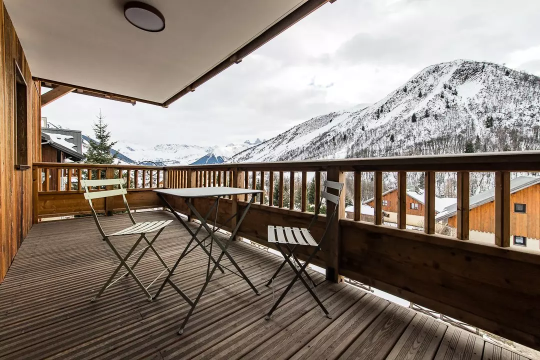 L'appartement est composé d'une pièce de vie ouvrant sur une terrasse meublée de 20m² exposée plein sud avec une vue splendide sur la montagne et les Aiguilles d'Arves.