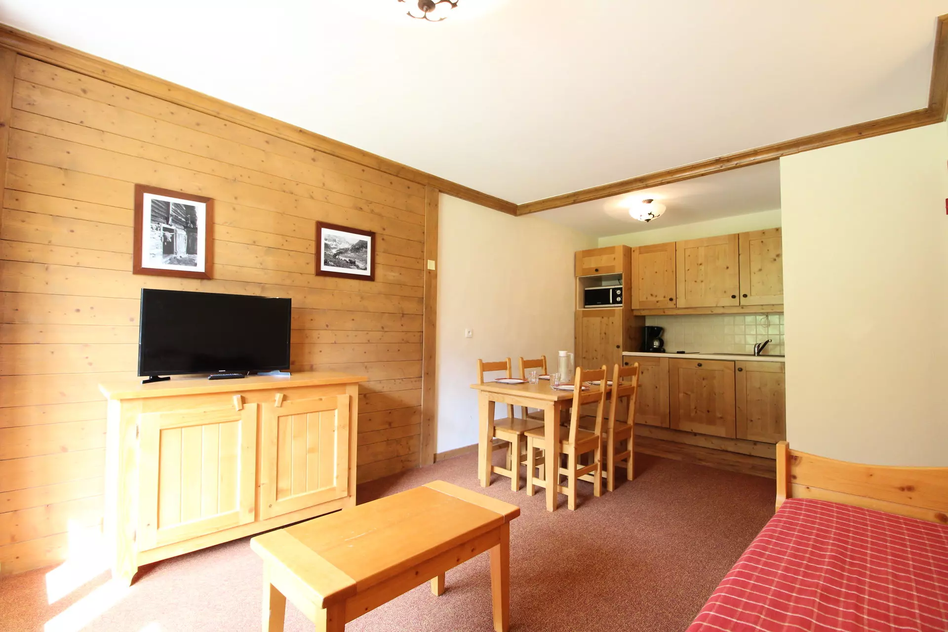 Séjour avec kitchenette équipée : micro-onde/grill, réfrigérateur, 3 plaques vitrocéramiques, lave vaisselle.