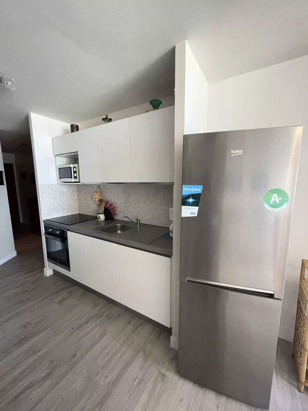 -Une cuisine ouverte et équipée avec micro-ondes, plaques électriques, réfrigérateur-congélateur, évier, grille-pain, cafetière, four;