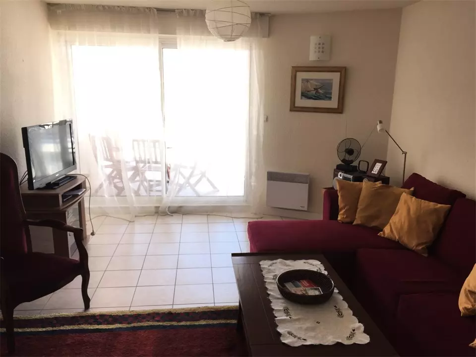 -Un séjour avec canapé et lit placard, portes vitrées donnant un accès balcon, table à manger pour 4 personnes, TV ;