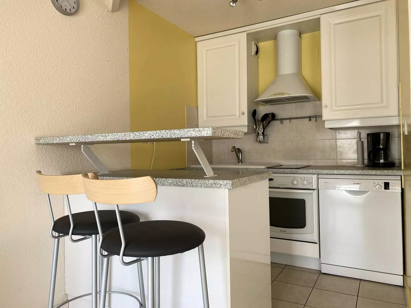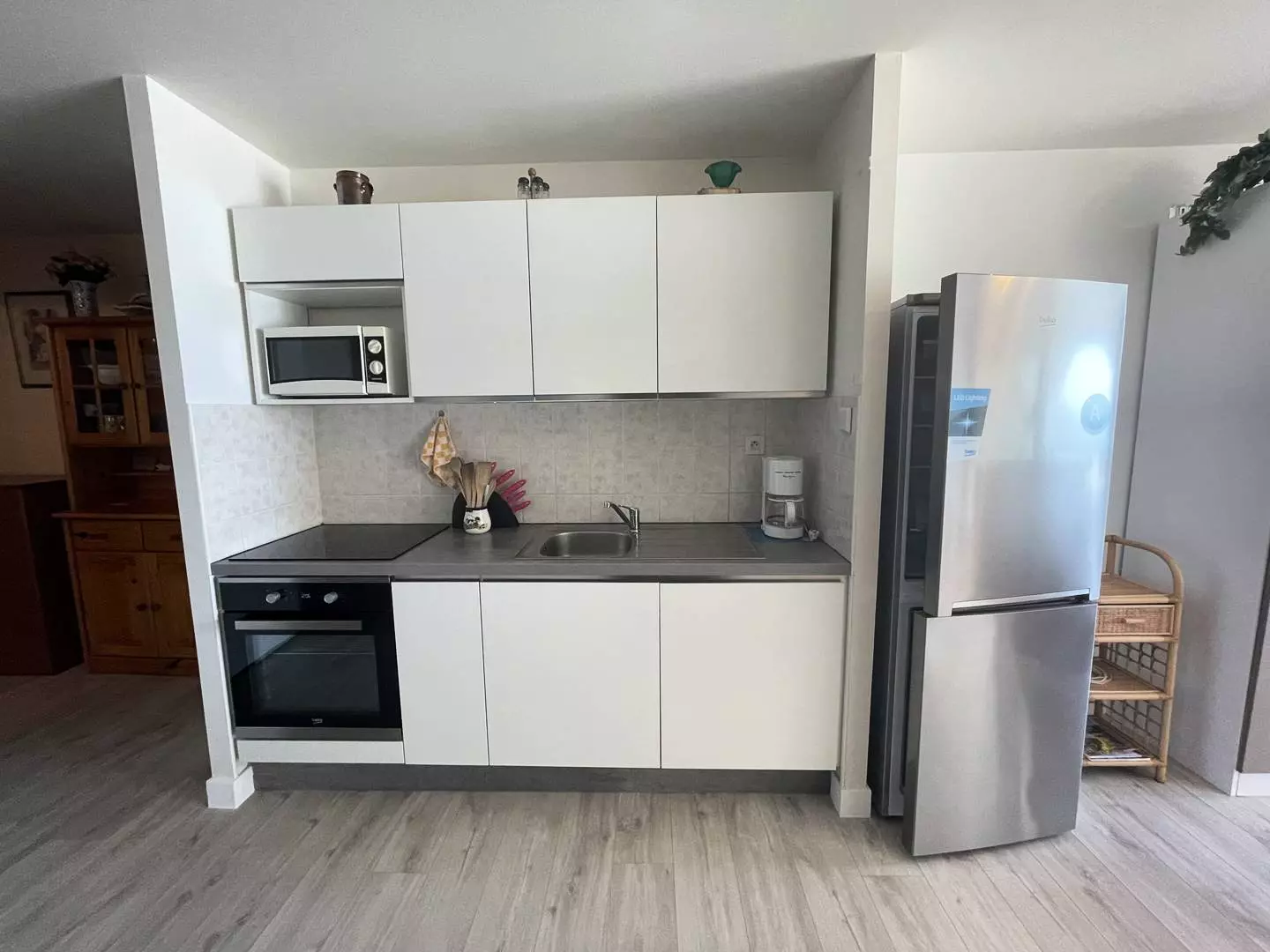 -Une kitchenette avec micro-ondes, plaques induction, four, réfrigérateur, évier, hotte, grille-pain, cafetière, lave-vaisselle;