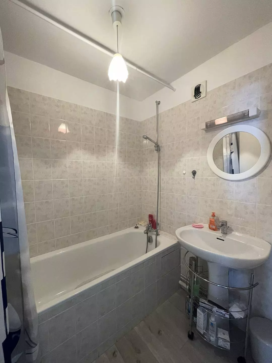 -Une salle d'eau avec baignoire, vasque, sèche-cheveux;