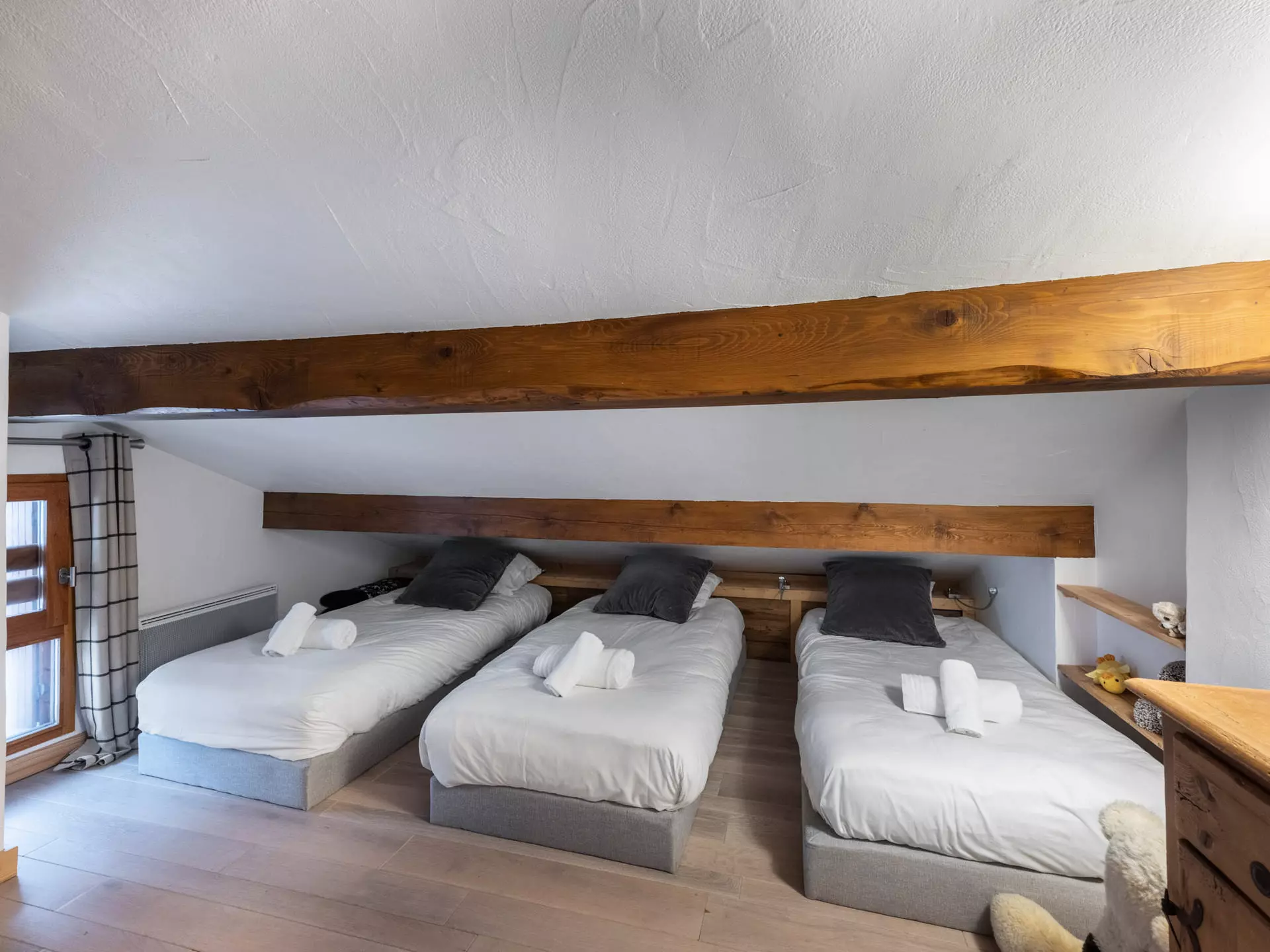 - Chambre 3 : 3 lits simples, TV (chambre sous les toits, hauteur sous plafond limitée) (90x190)