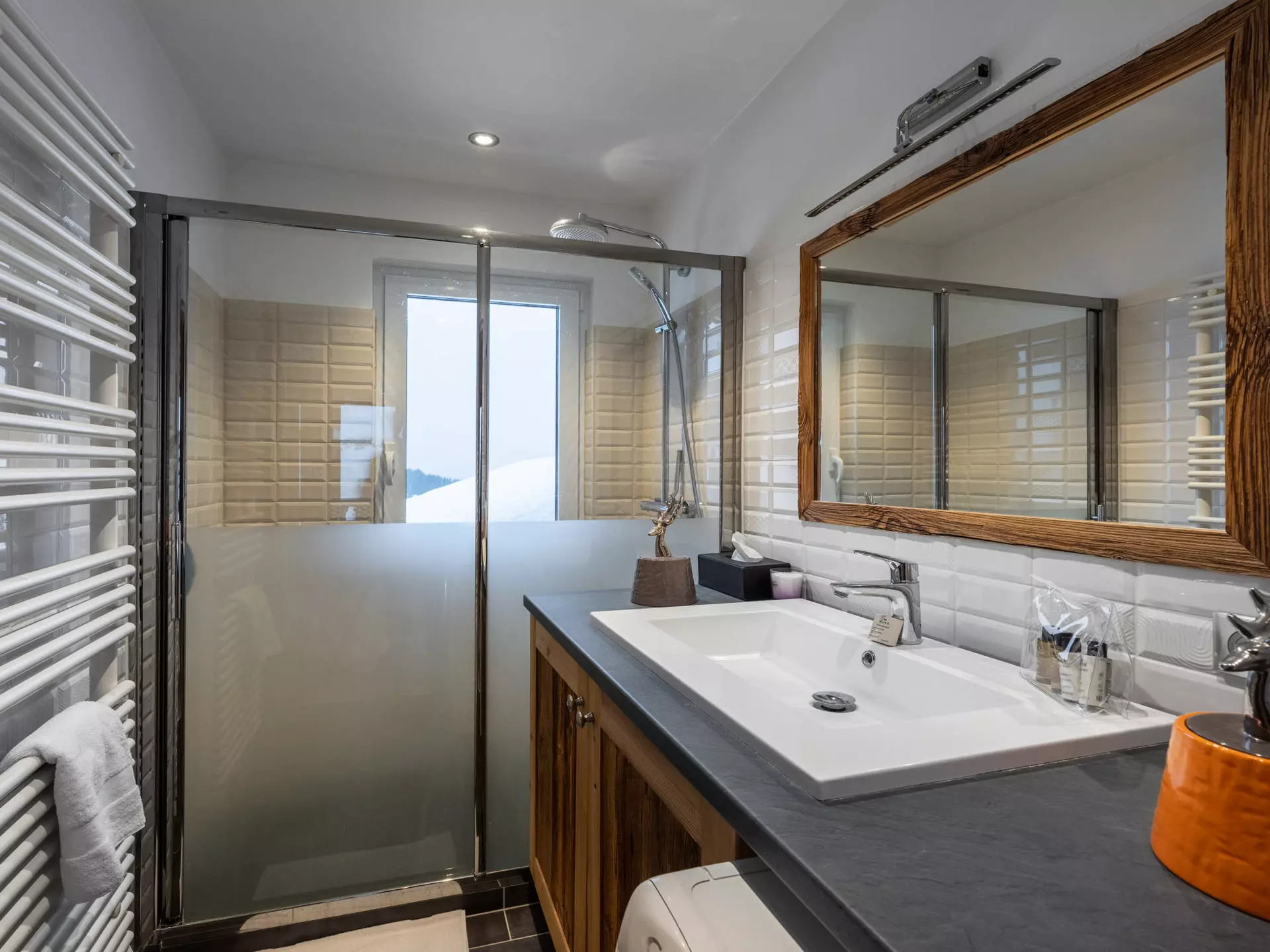 - Salle de douche avec vasque simple, sèche-serviettes, lave-linge