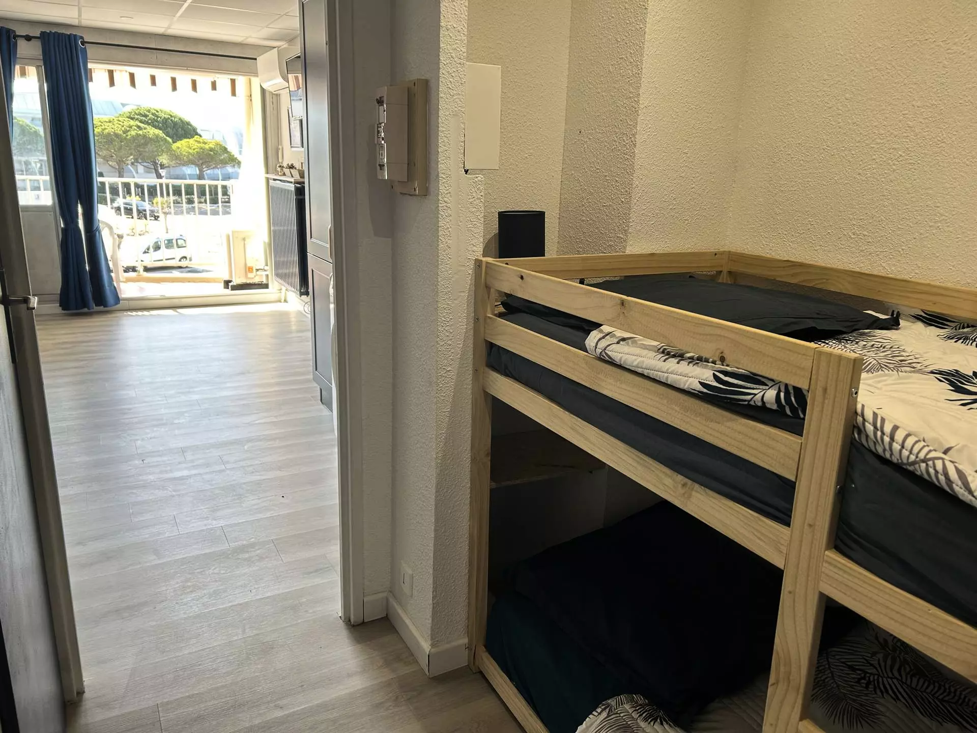 Situé au 1er étage d'une résidence qui en comporte trois, cet appartement se compose d'une entrée avec 2 lits superposés,et 'une cabine avec un lit en 140, d'une salle de bain, wc séparés, d'une kitchenette équipée avec deux plaques électriques et four, d'un séjour avec un canapé non convertible, téléviseur.