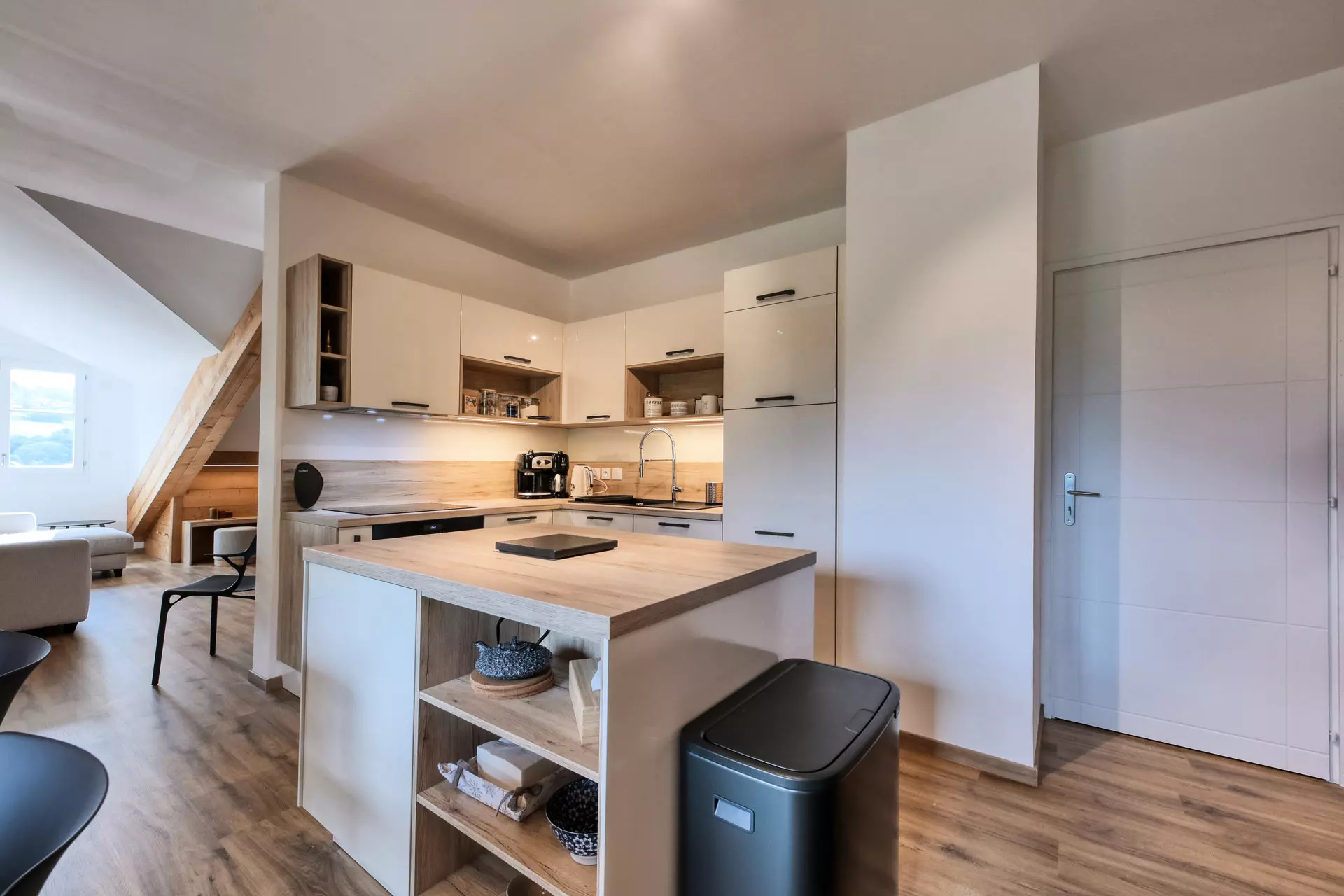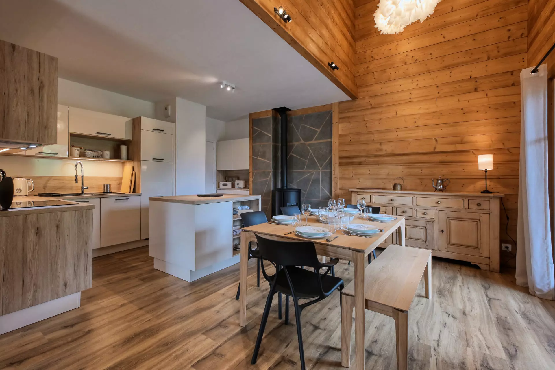 - Cuisine équipée ouverte sur une salle à manger avec cheminée