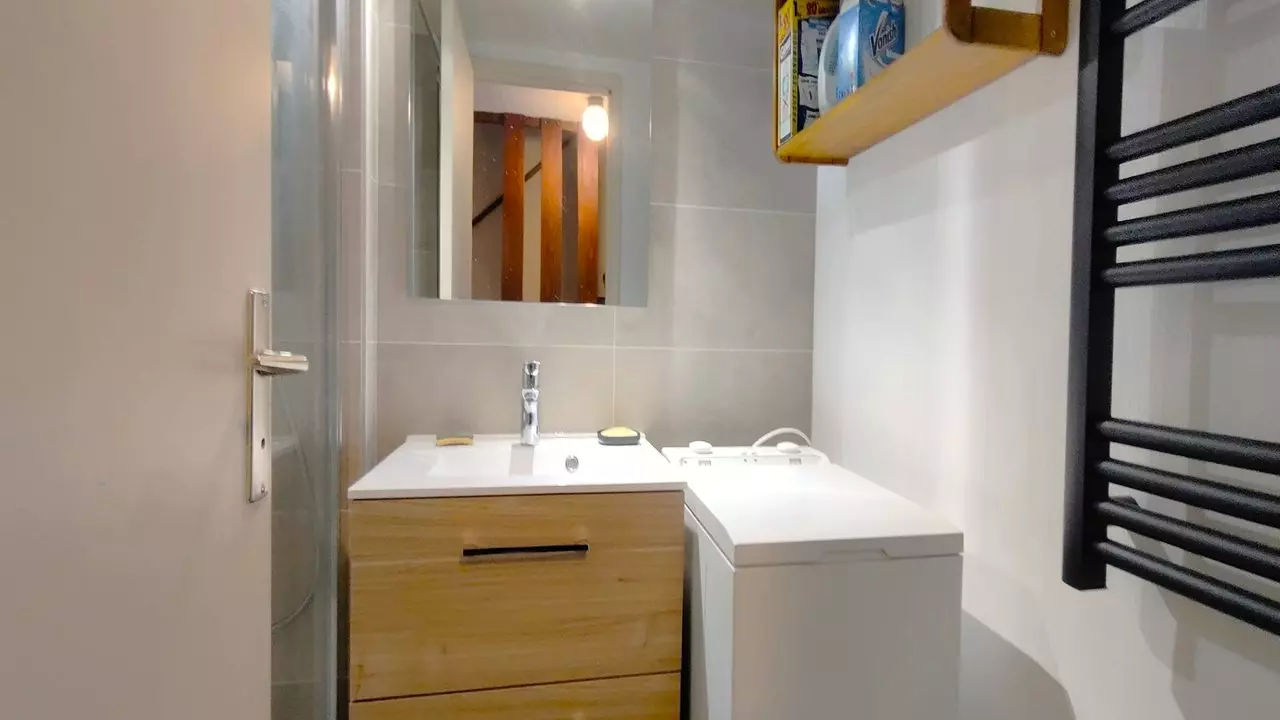 Appartement de montagne avec 4/6 couchages. Il se compose d'une entrée, d'une mezzanine avec deux lits simples 90x190 (lit tiroir), une chambre avec un lit double en 160x200 et placards , une salle d'eau avec douche, un WC séparé.