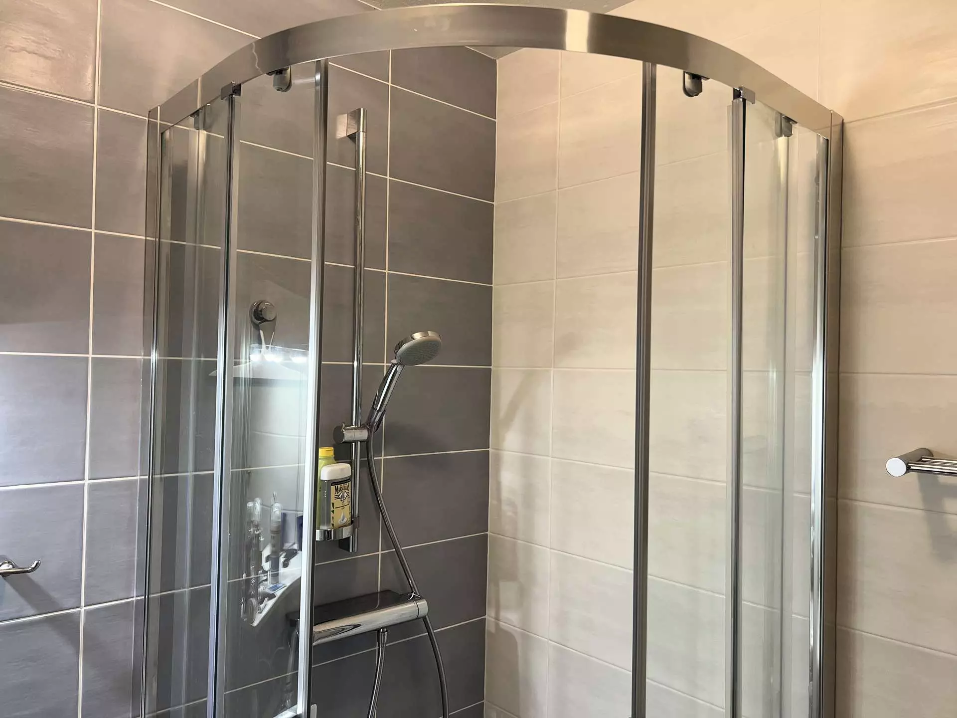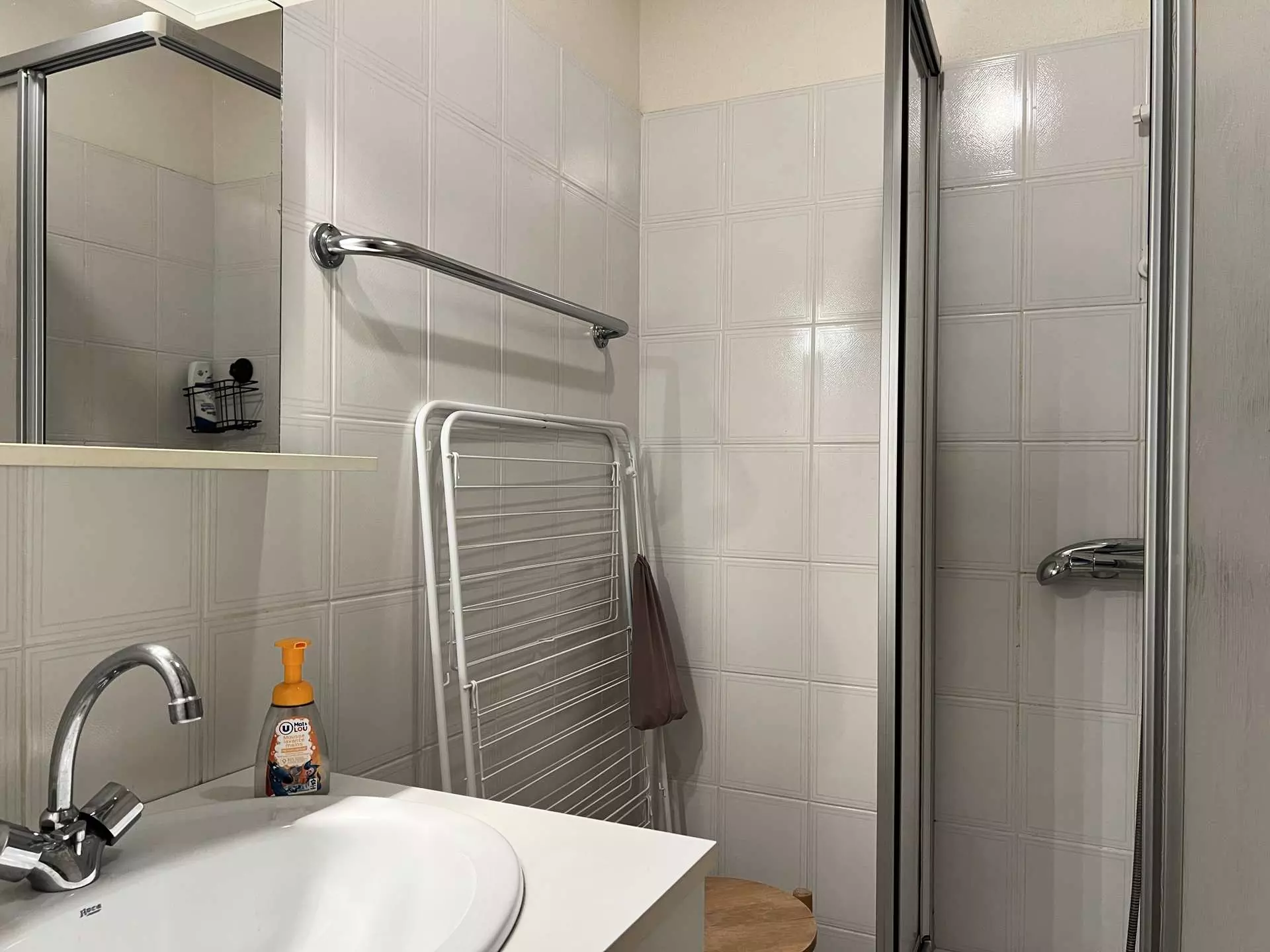 - Salle d'eau avec douche meuble vasque et sèche serviette;