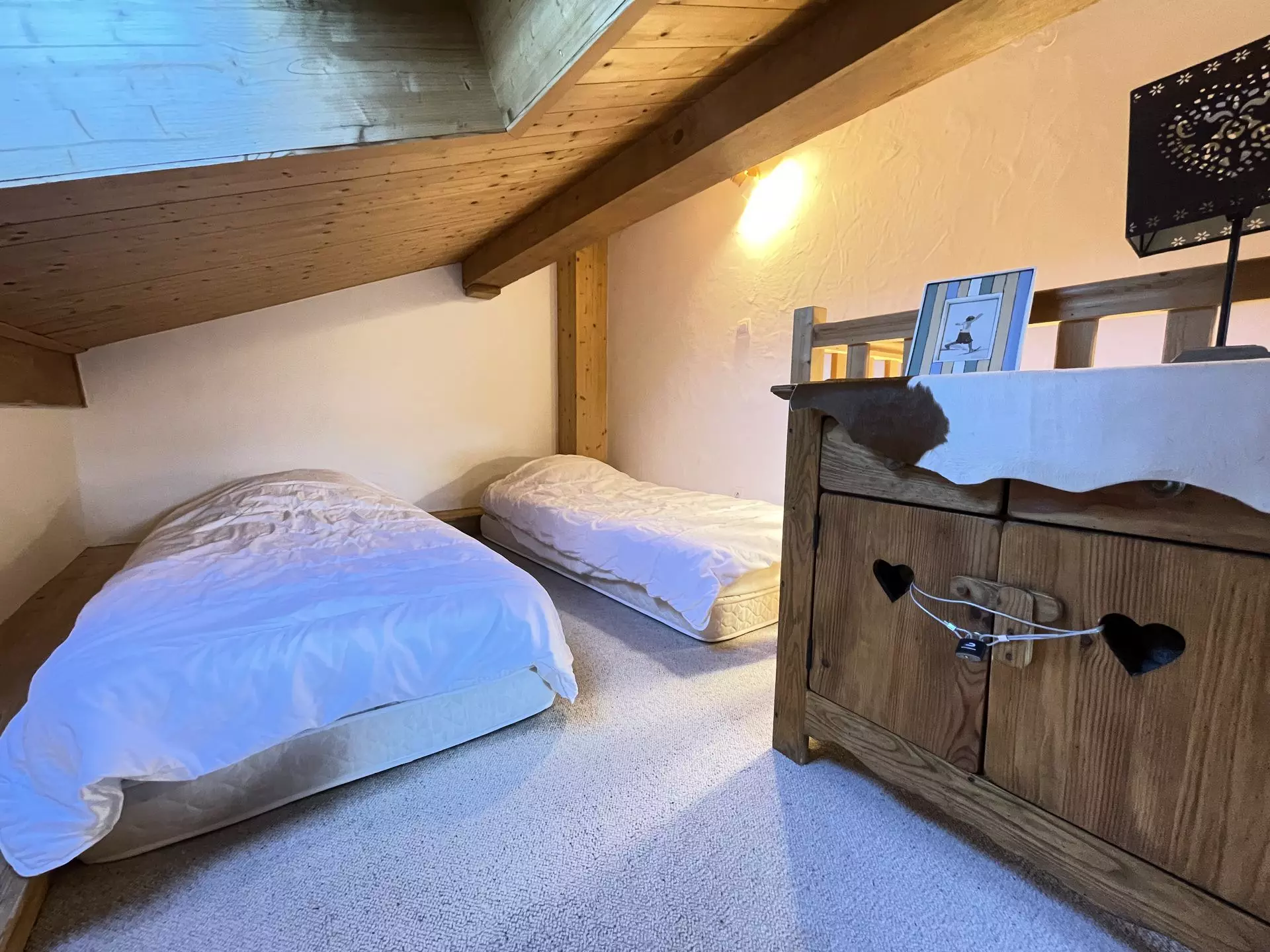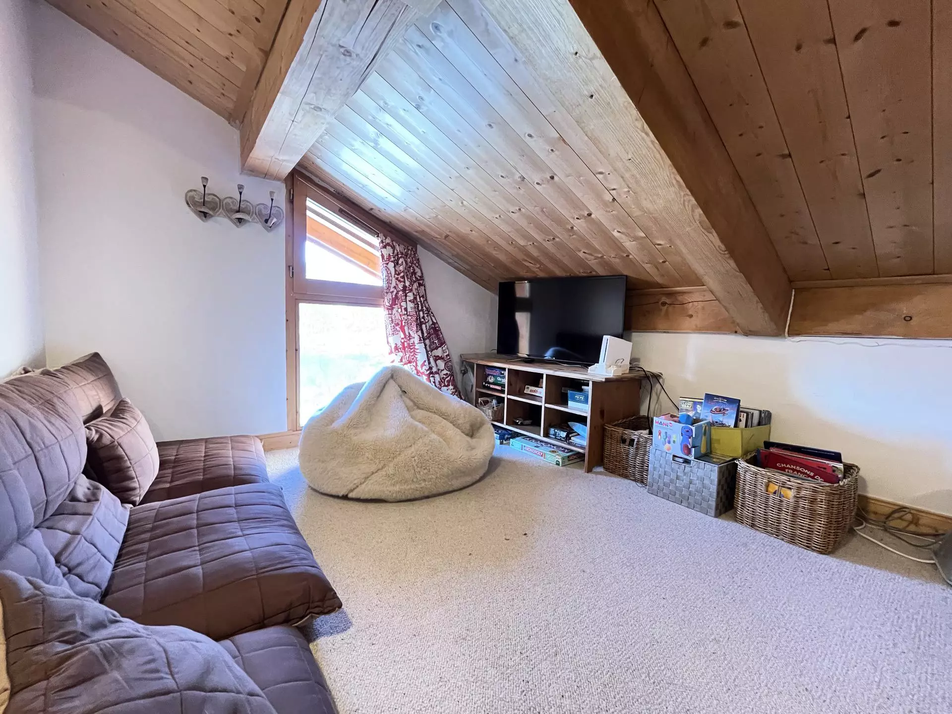 - Une mezzanine comprenant une télévision, un espace jeux et un coin nuit équipé de deux lits simples 2*90 cm (couchages pour enfants)
