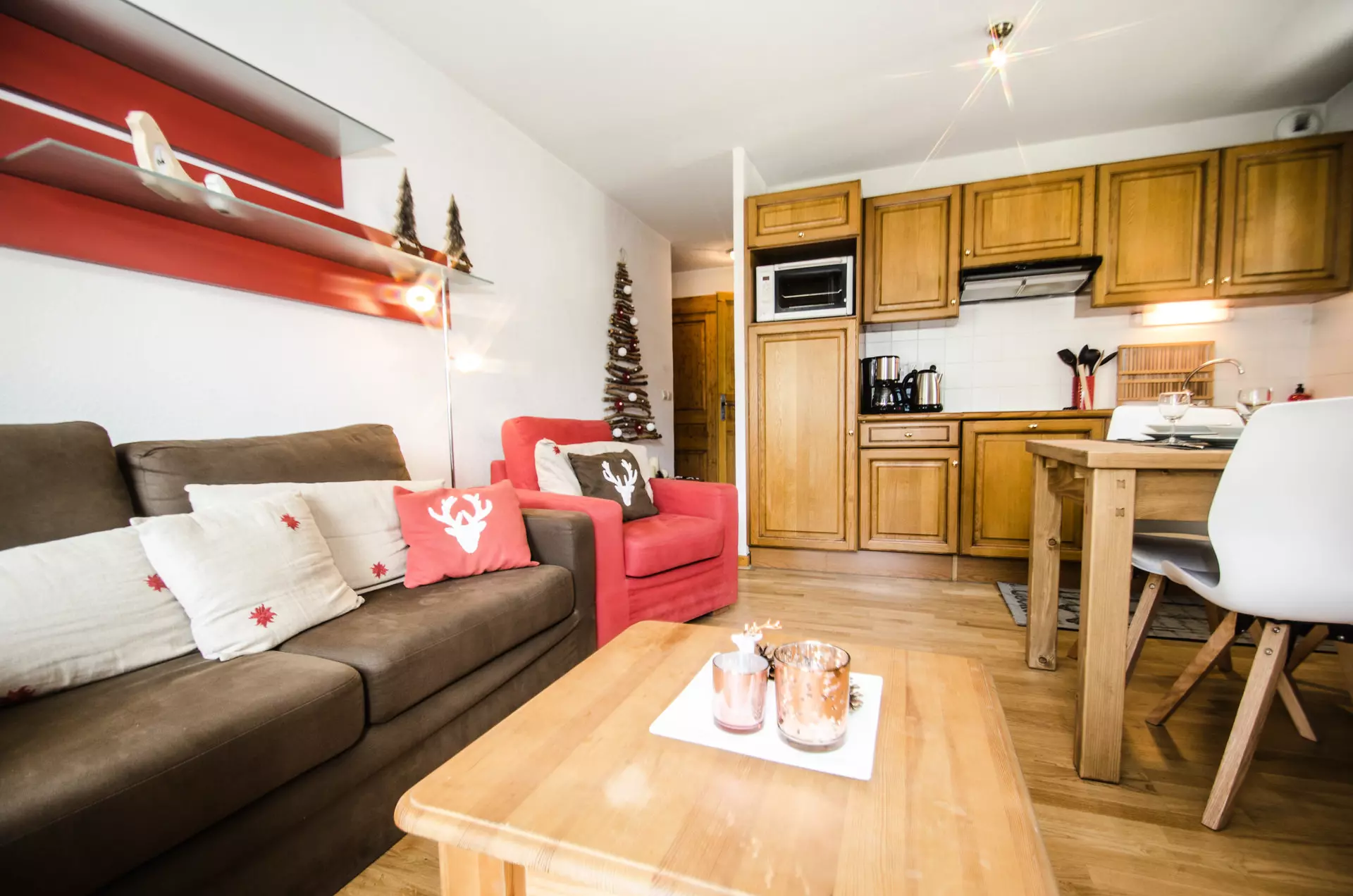- Cuisine équipée ouverte (réfrigérateur, mini-four, plaques vitrocéramiques, micro-ondes, lave-vaisselle, hotte, cafetière filtre, bouilloire, grille-pain)