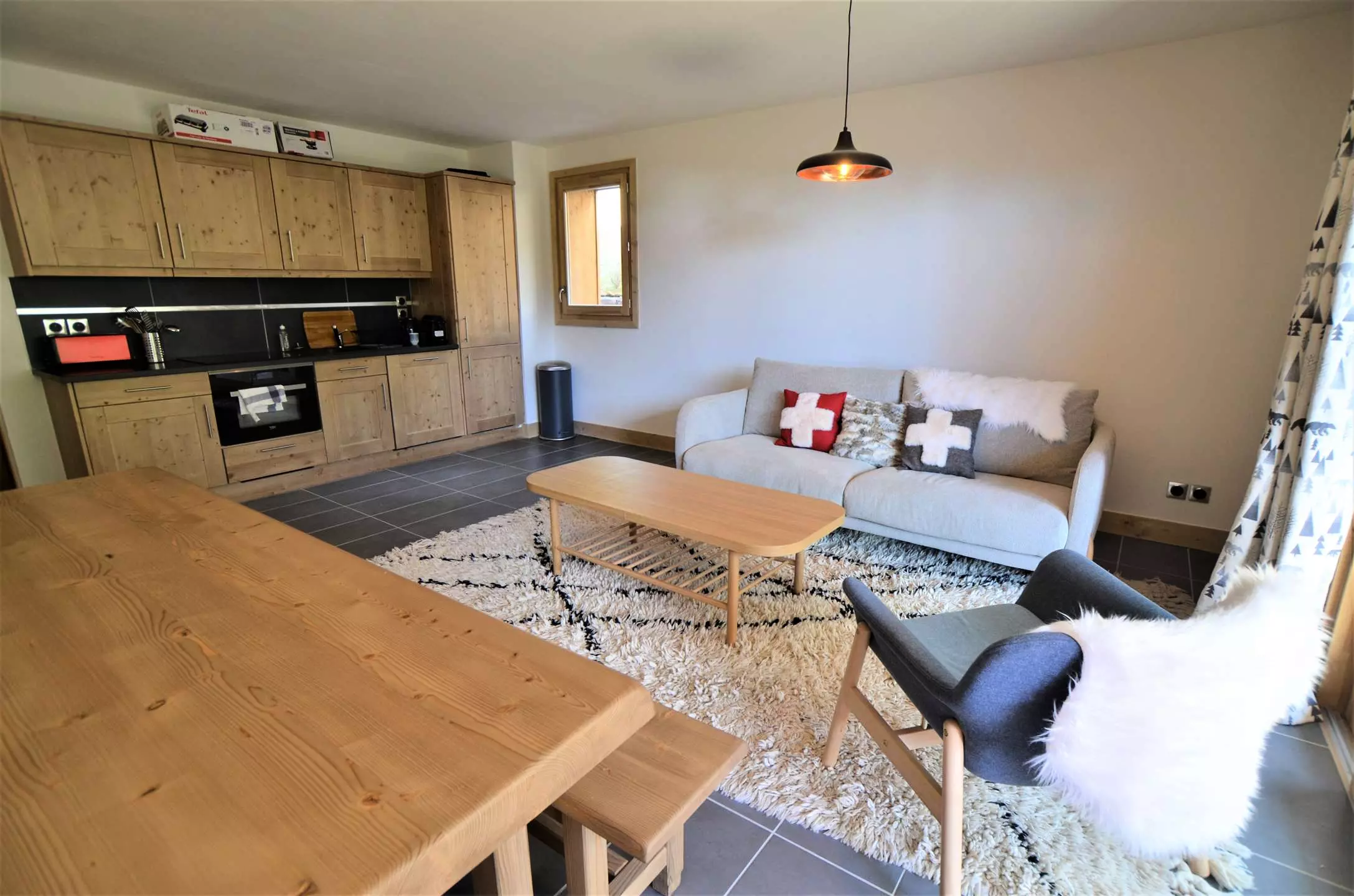 Cet appartement haut de gamme est loué pour 6 personnes. Il est composé d'une chambre avec lit double avec balcon privatif et salle de douche avec WC, une chambre avec 2 x 2 lits superposés, une salle de bains avec WC et une cuisine équipée ouverte sur le séjour donnant sur un balcon orienté Ouest avec une très belle vue sur nos montagnes et vallée.