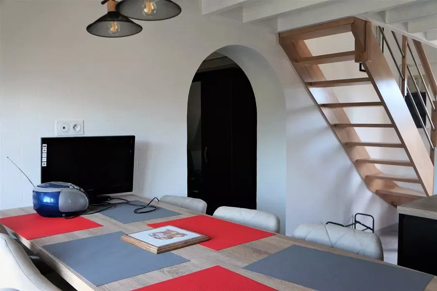 - un séjour avec cuisine équipée, avec banquette et télévision, donnant sur la véranda avec accès au jardin
