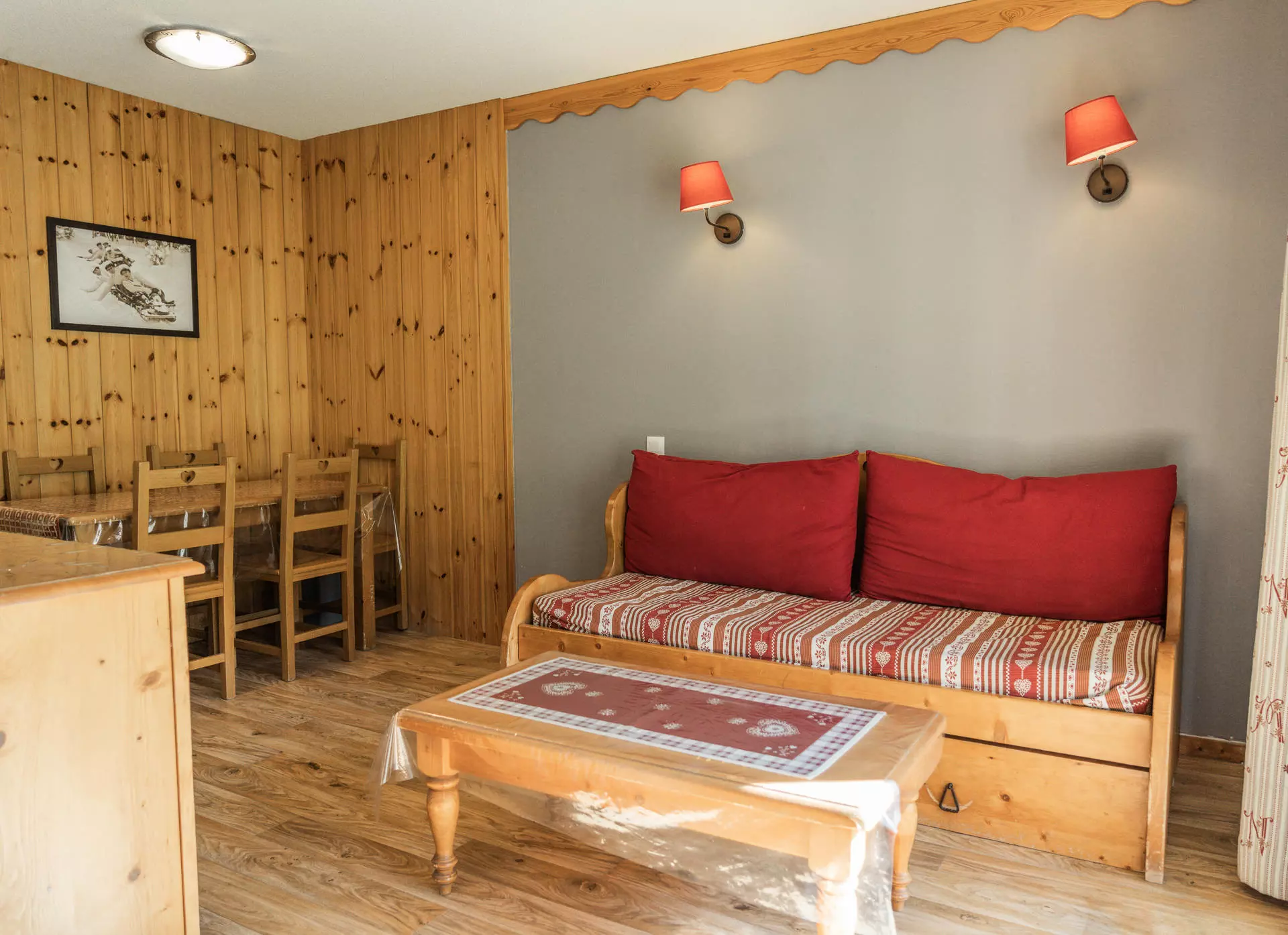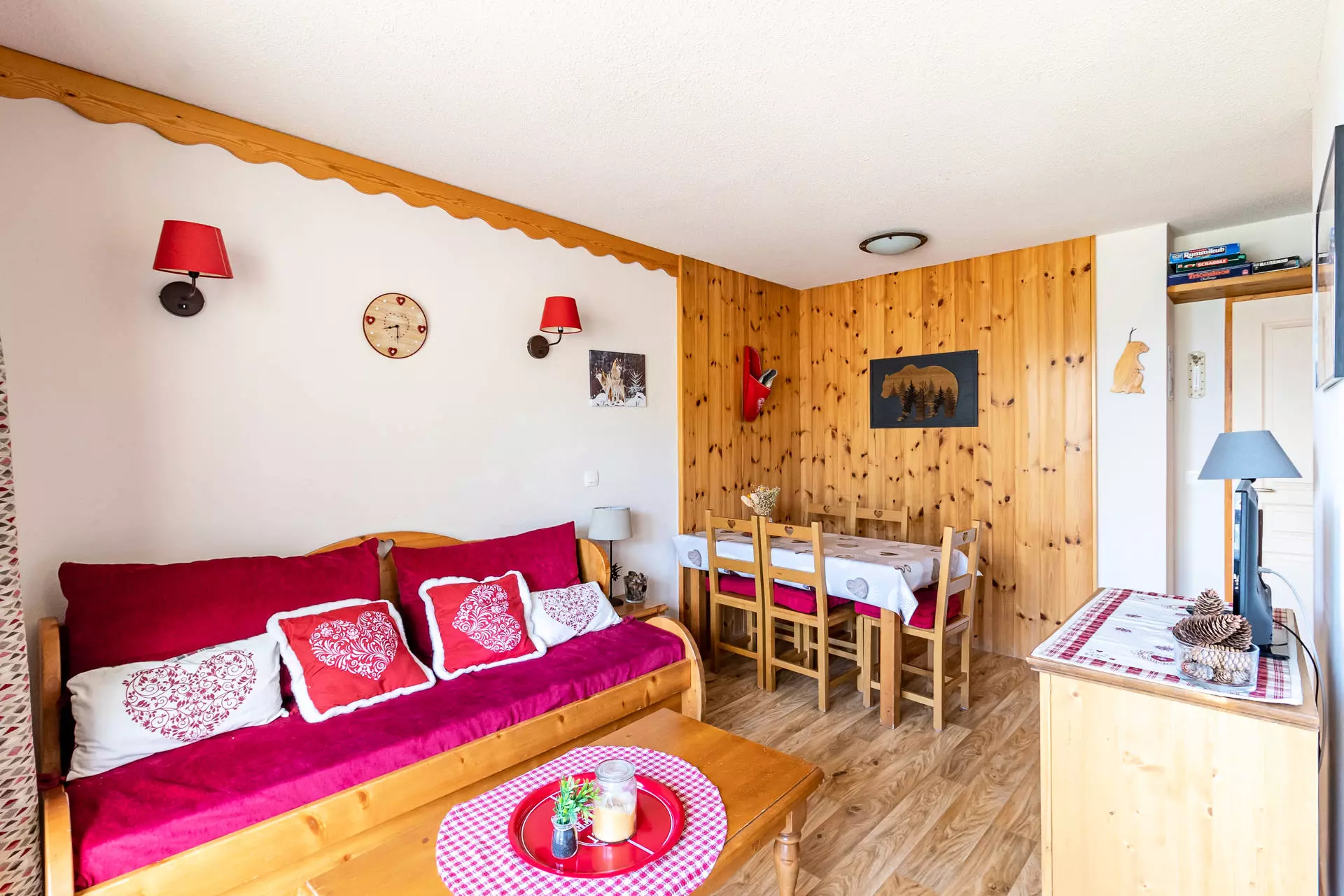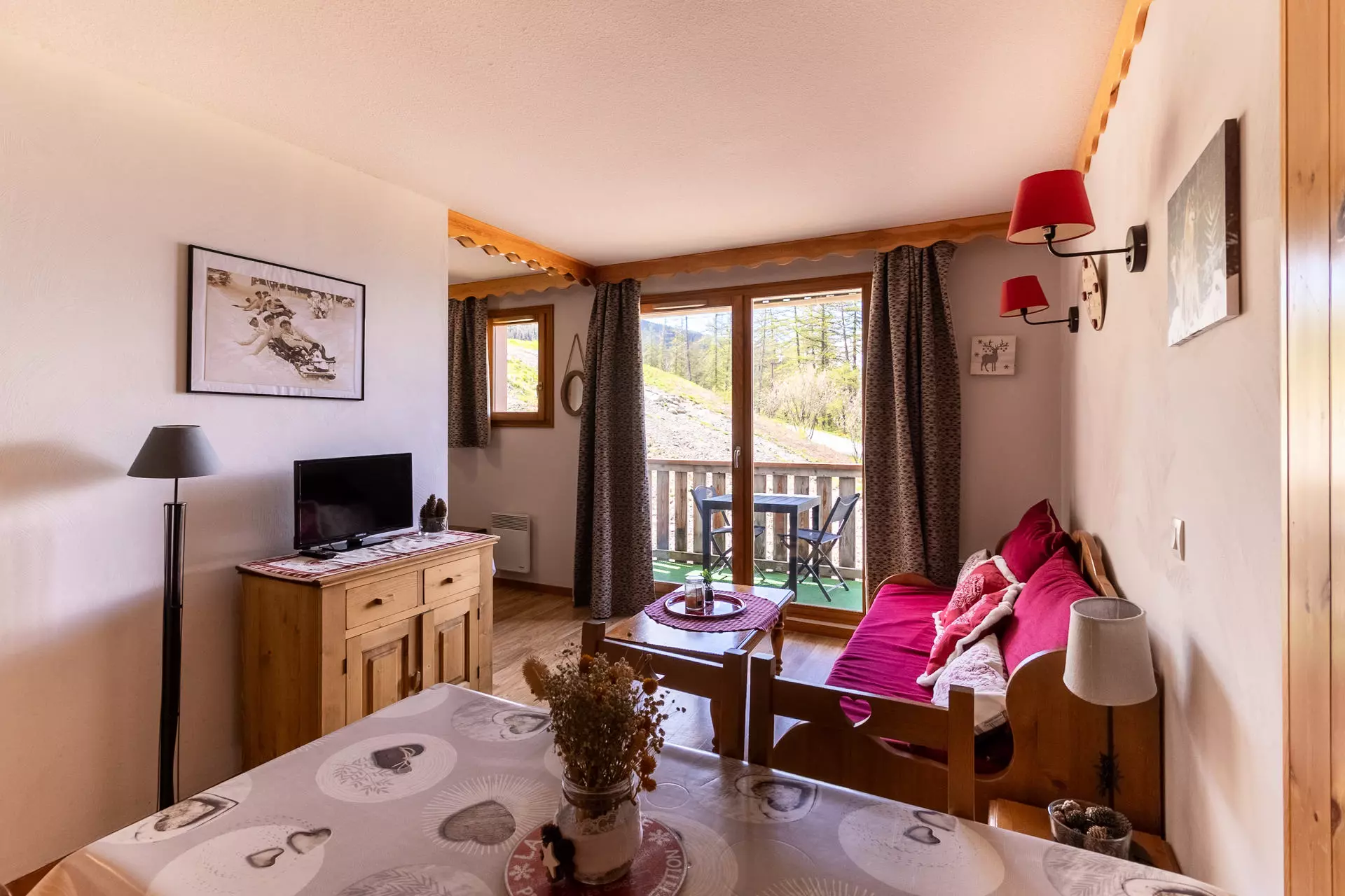 Décoré dans un style de montagne, l'appartement se compose d'un grand séjour avec un canapé-lit gigogne 2 places et la télévision. De cette pièce, vous accédez à la terrasse et son salon de jardin, pour des petits-déjeuners, apéritifs, etc.