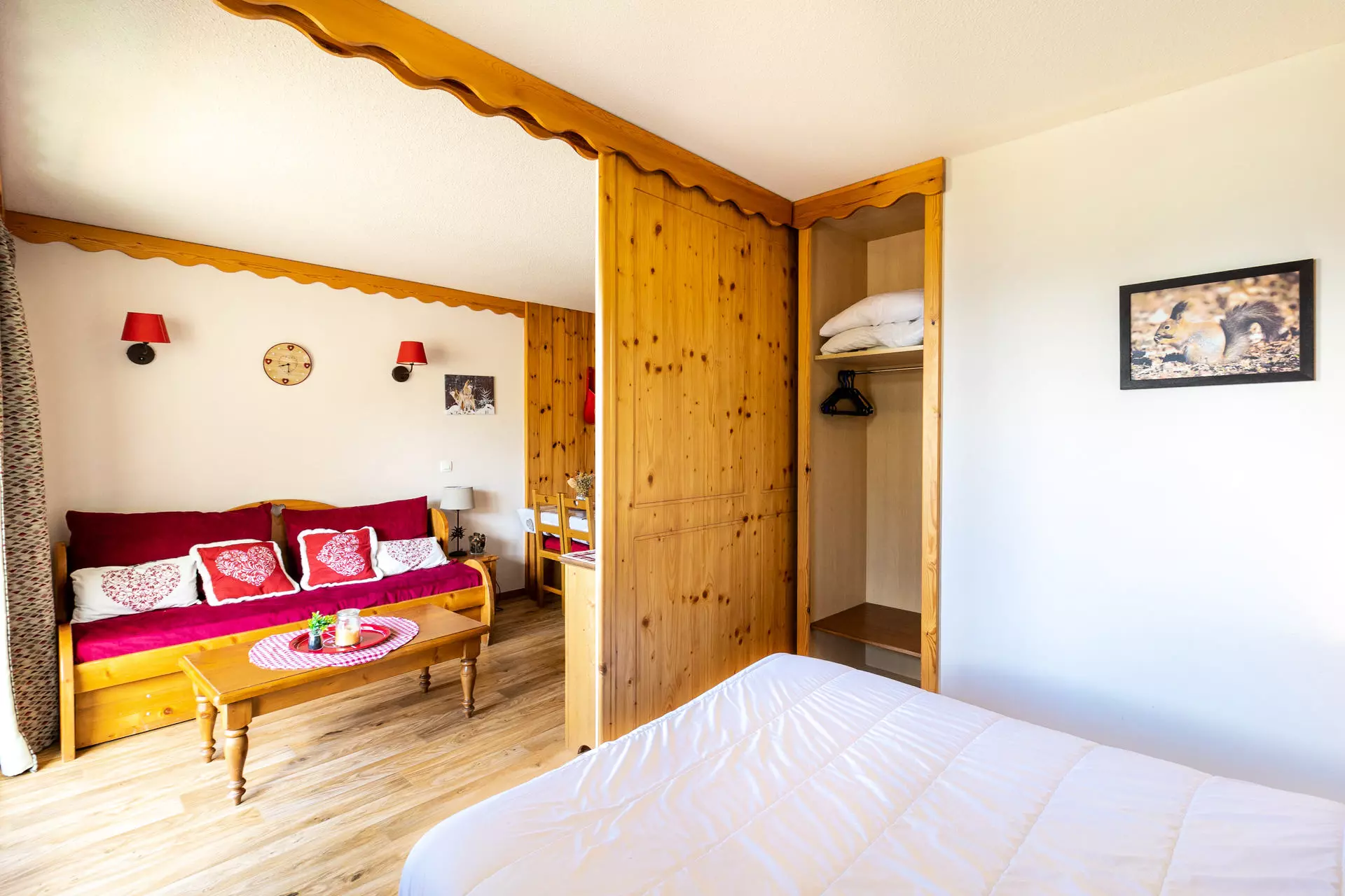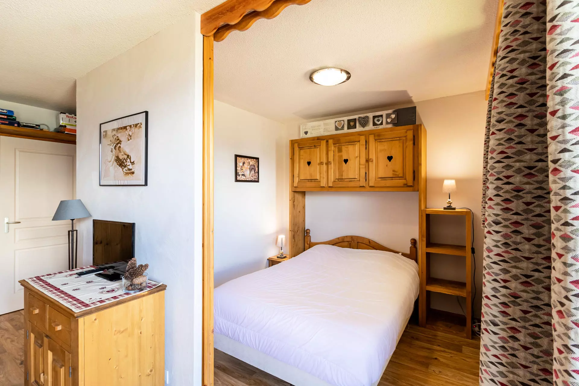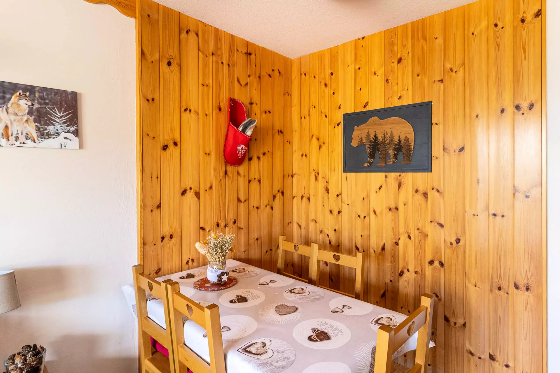 Décoré dans un style de montagne, l'appartement se compose d'un grand séjour avec un canapé-lit gigogne 2 places et la télévision. De cette pièce, vous accédez à la terrasse et son salon de jardin, pour des petits-déjeuners, apéritifs, etc.