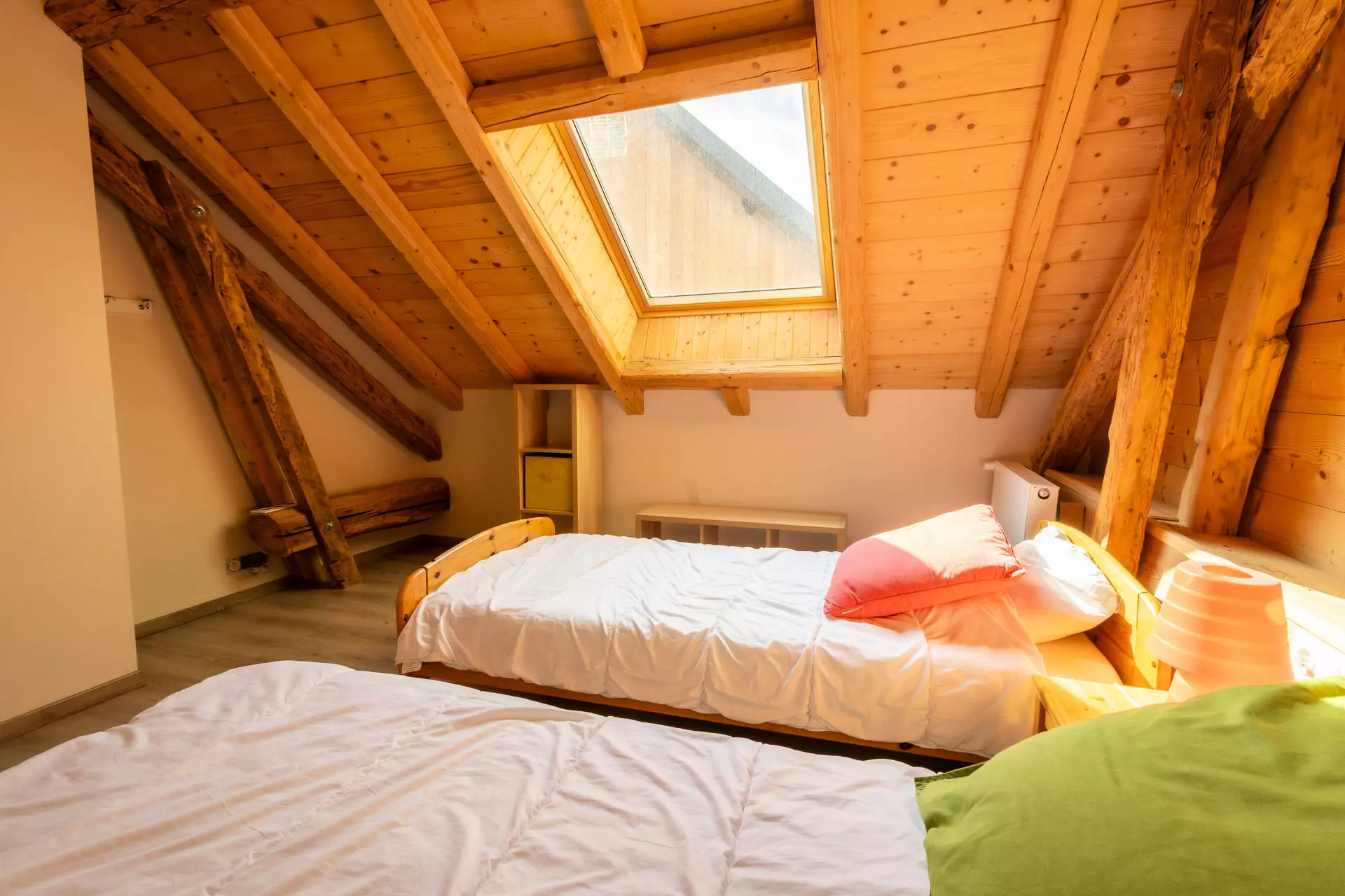 Chambre 1 (10m²/ Vélux Est) : 2 lits simples (2x 90x190cm)
