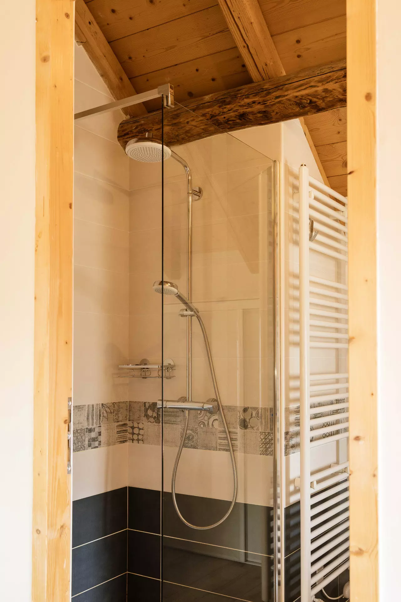 Salle de bains : lavabo, douche et sèche-cheveux. WC indépendant.
