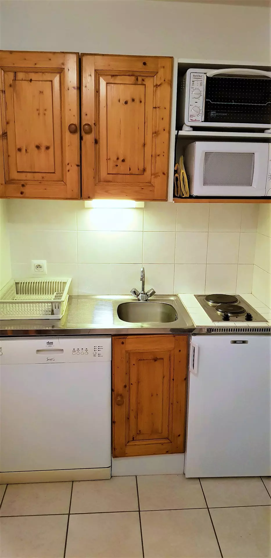 Coin cuisine équipé avec plaques électriques, réfrigérateur, micro-ondes, lave-vaisselle, four, cafetière à filtre, et cafetière Dolce Gusto,grille-pain, bouilloire, appareil à fondue bourguignonne, mixeur, nécessaire de vaisselle.