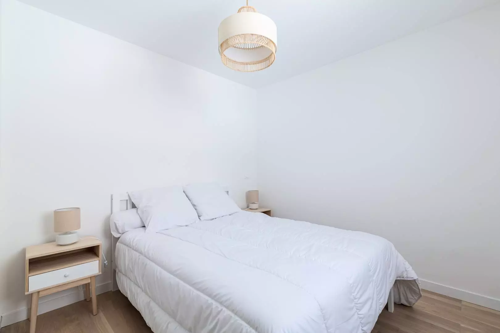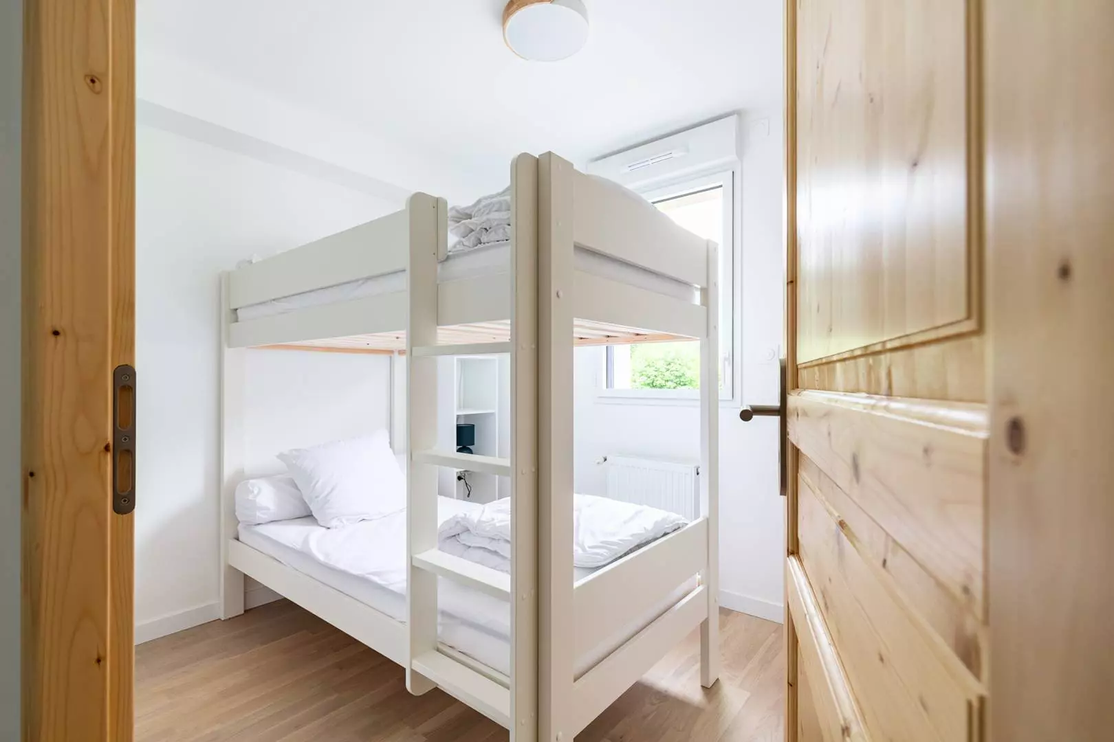Une chambre avec 1 grand lit et une chambre avec 2 lits superposés en 140